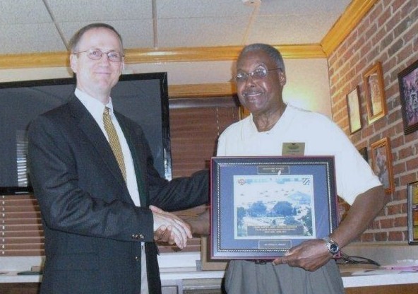 Tom Fry, Hunter Army Airfield deputy garrison commander, presents a plaque to 81-year-old Don Wright, a retired U.S. Army sergeant major, and shakes his hand at his retirement luncheon on June 23. Wright retires from the Hunter Substance Abuse Progra... (Photo Credit: U.S. Army) VIEW ORIGINAL