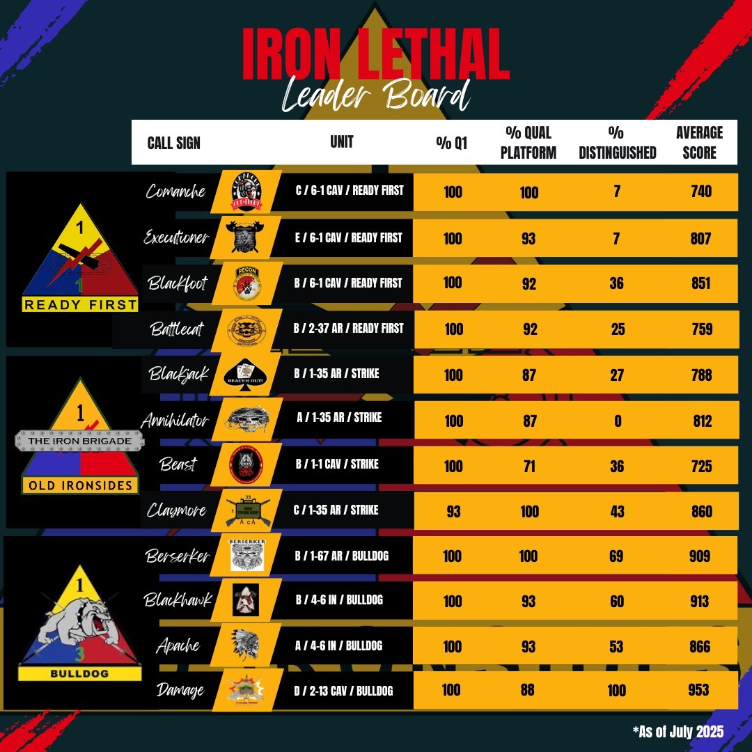 The most lethal companies in the 1st Armored Division are displayed on the Iron Lethal Leader Board.