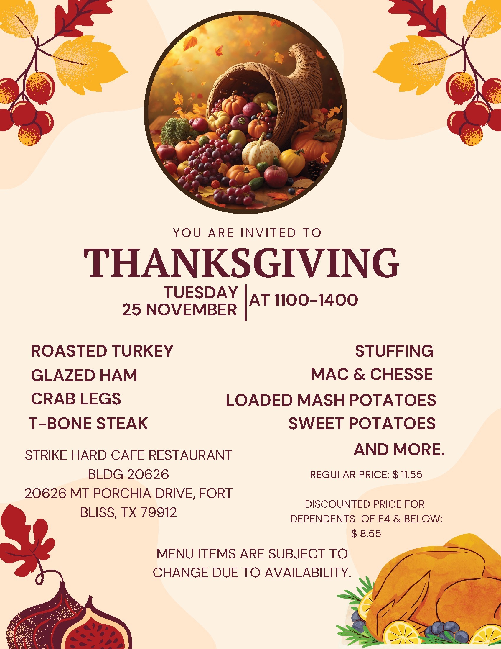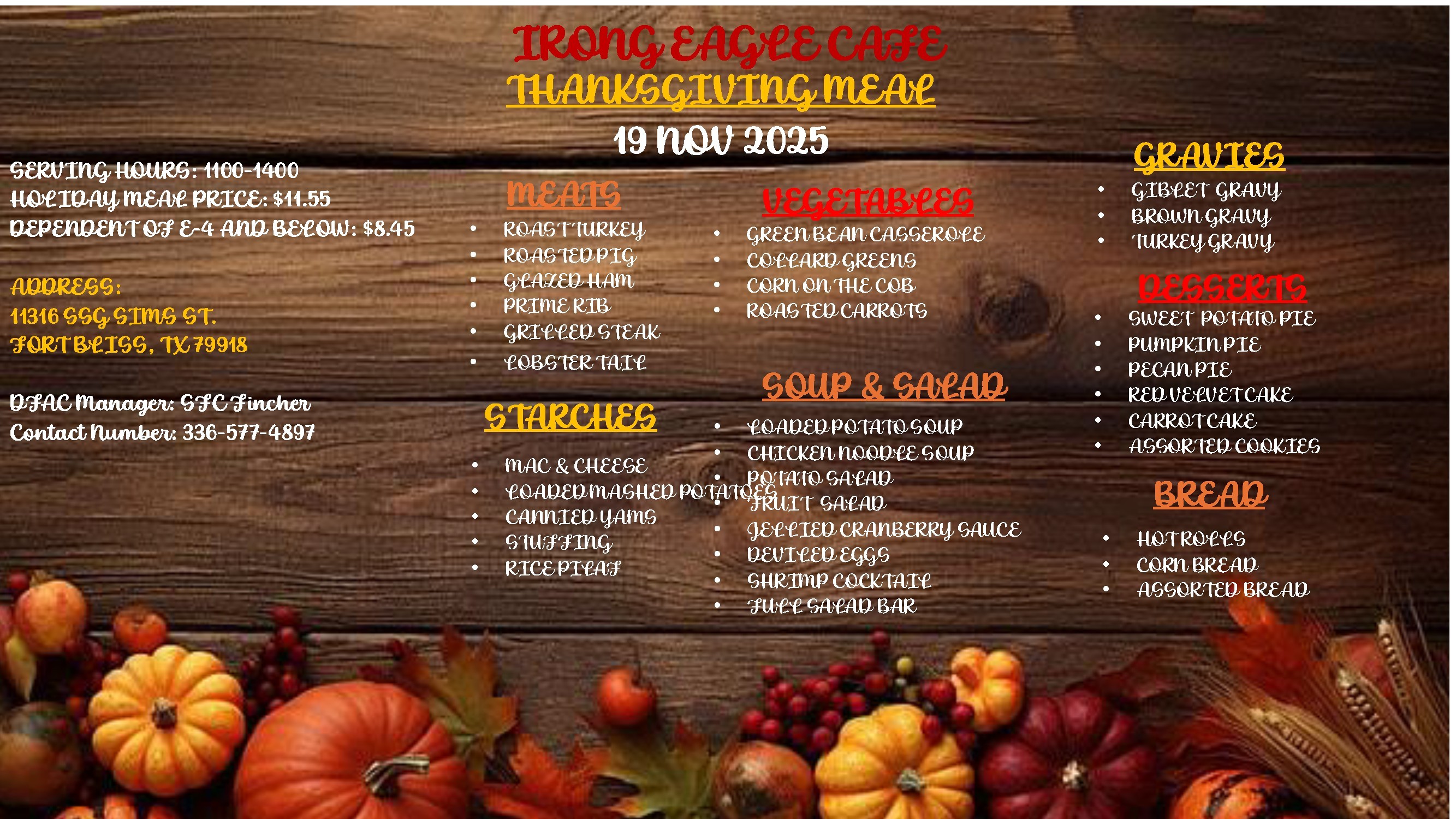 Join us for a Thanksgiving Meal at our various Warrior Restaurants!