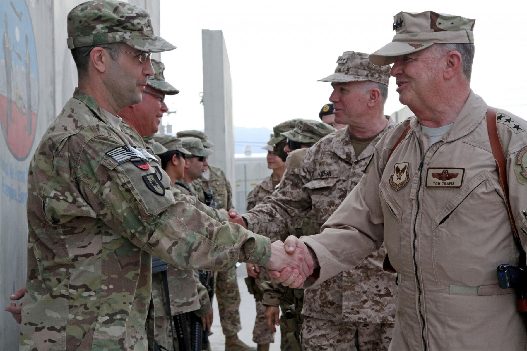 Lt. Gen. (Dr.) Thomas Travis, surgeon general, U.S. Air Force, greets service members at Craig Joint Theater Hospital during a tour of the airfield's medical facilities, April 17, 2013. The surgeons general were shown Bagram Air Field's medical capab...