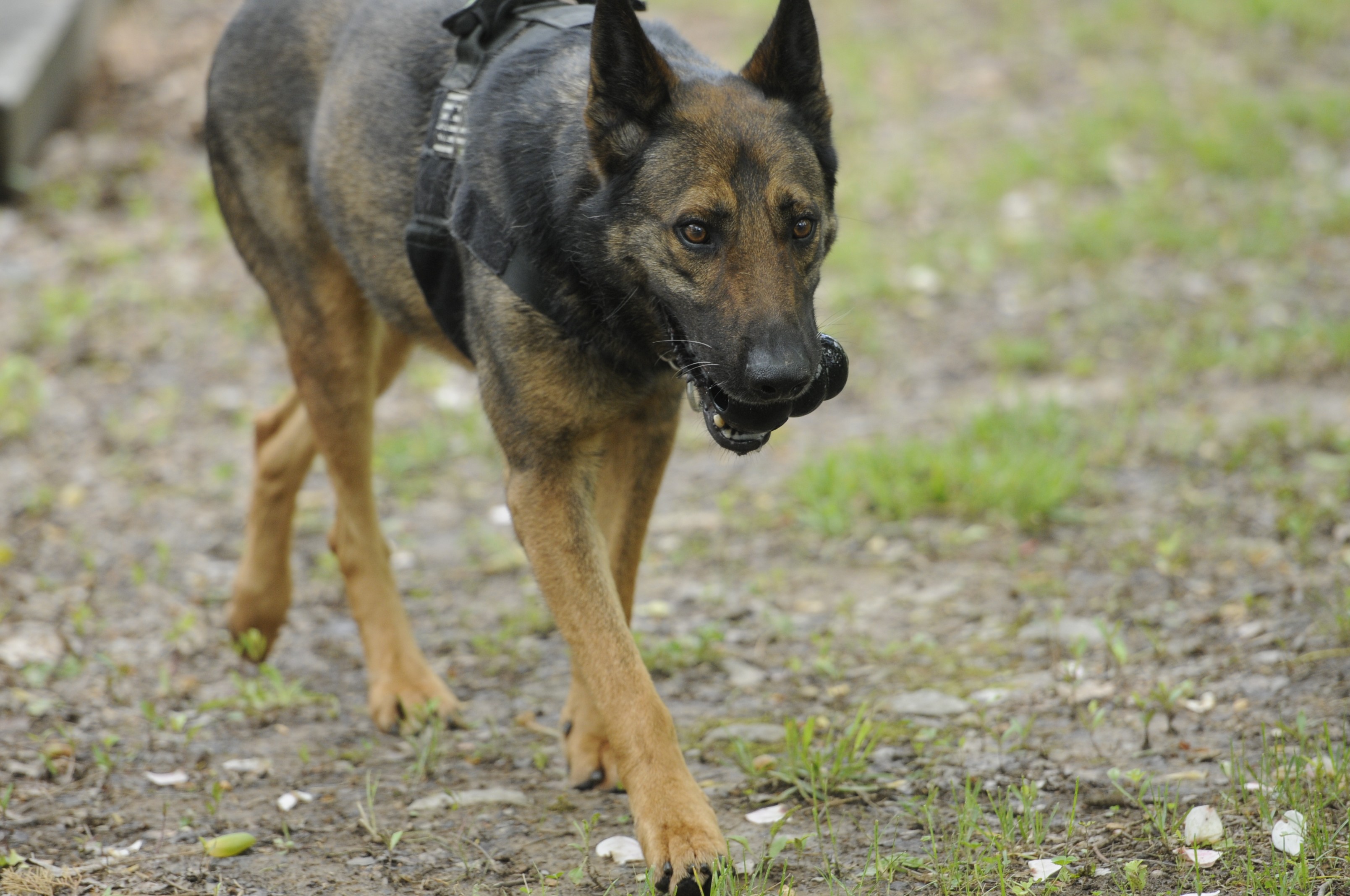 Staff Sgt. J.R., a specialized search dog assigned to the 510th Military Police Company, 716th Military Police Battalion, 101st Sustainment Brigade, 101st Airborne Division (Air Assault), plays with his toy moments after correctly identifying an obje...