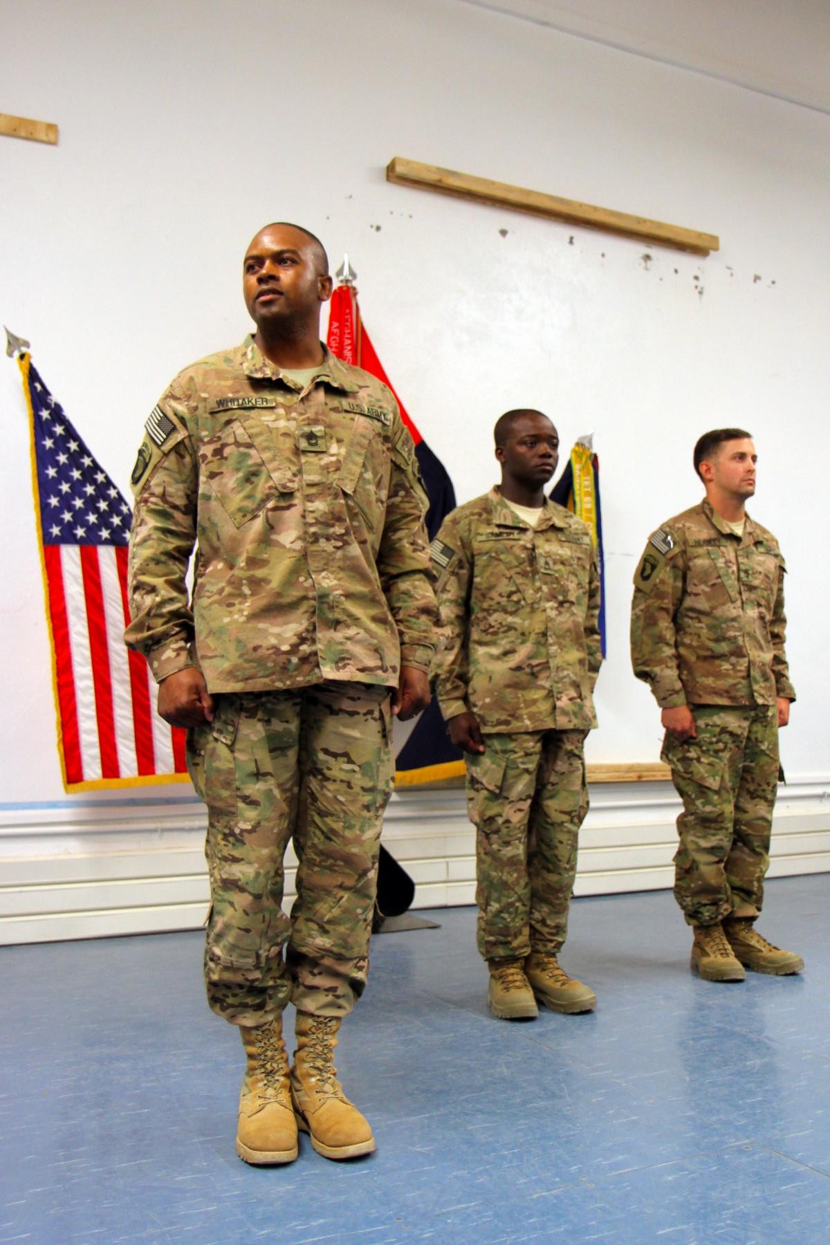 Having accomplished those feats, Whitaker, Sgt. 1st Class Spencer A. Headley, Sgt. 1st Class Tcherry Samedy and Staff Sgt. Joshua Cook, all Soldiers with the 4th Brigade Combat Team, 101st Airborne Division (Air Assault), were inducted in to the SAMC during ceremonies held on Forward Operating Bases Salerno and Lightning.