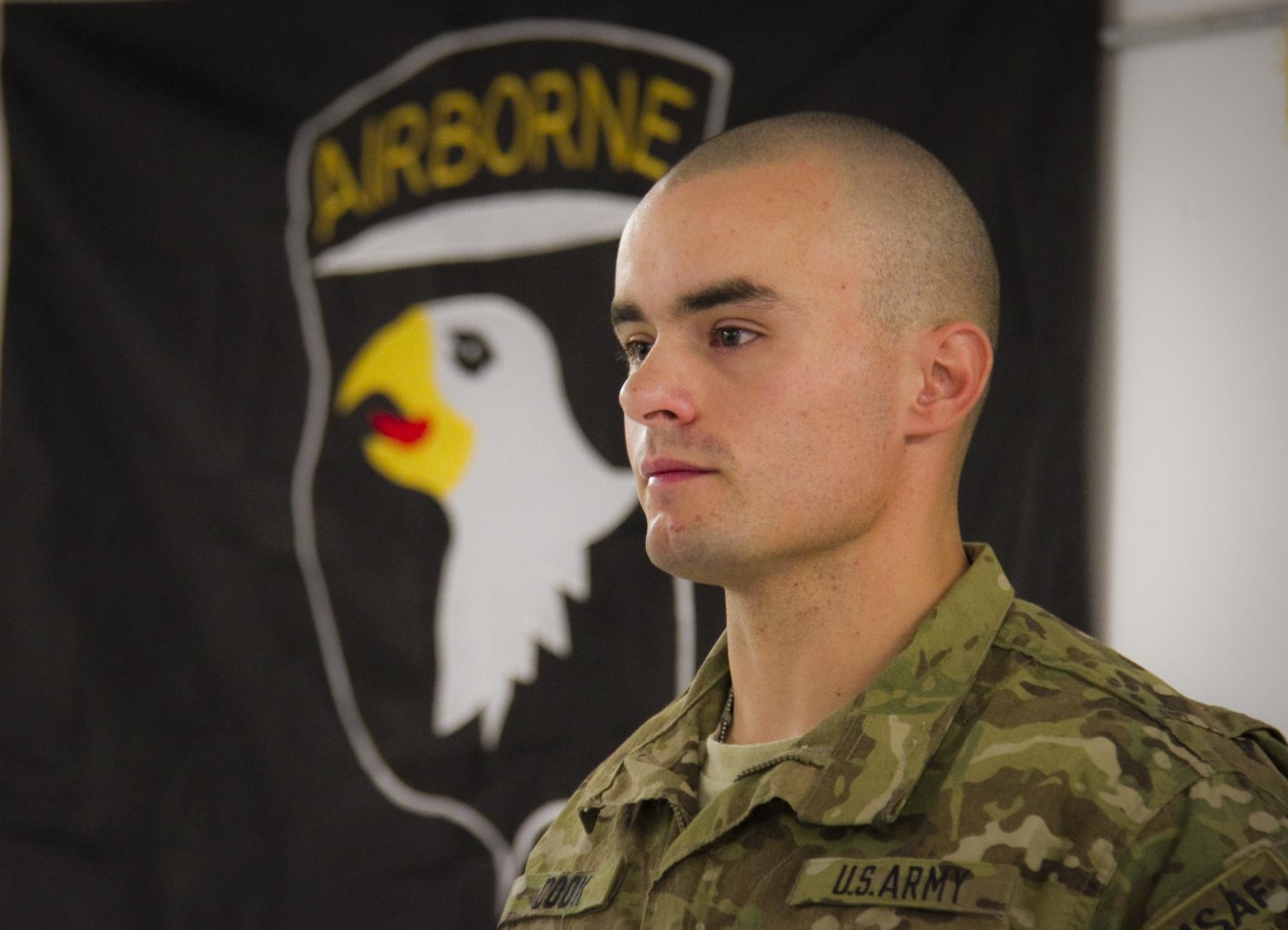 U.S. Army Staff Sgt. Joshua Cook, a cannon crew member with Battery A, 4th Battalion, 320th Field Artillery Regiment, 4th Brigade Combat Team, 101st Airborne Division (Air Assault), wears his Sergeant Audie Murphy medallion with pride after being ind...