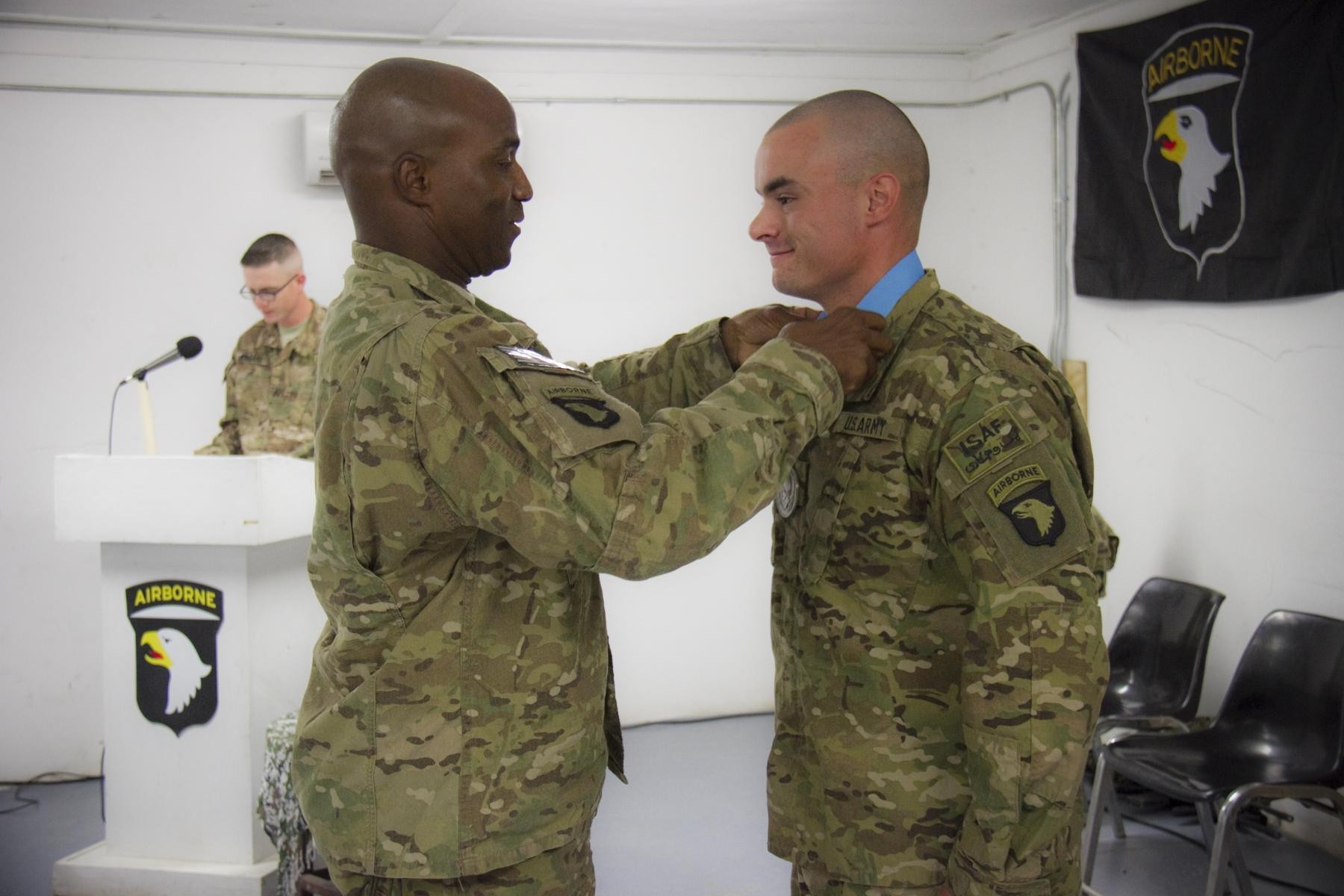 U.S. Army Sgt. 1st Class Tcherry Samedy (right), a Soldier with the 801st Brigade Support Battalion, 4th Brigade Combat Team, 101st Airborne Division, receives a U.S. Army his Forces Command Certificate of Achievement from Col. Val C. Keaveny Jr., co...