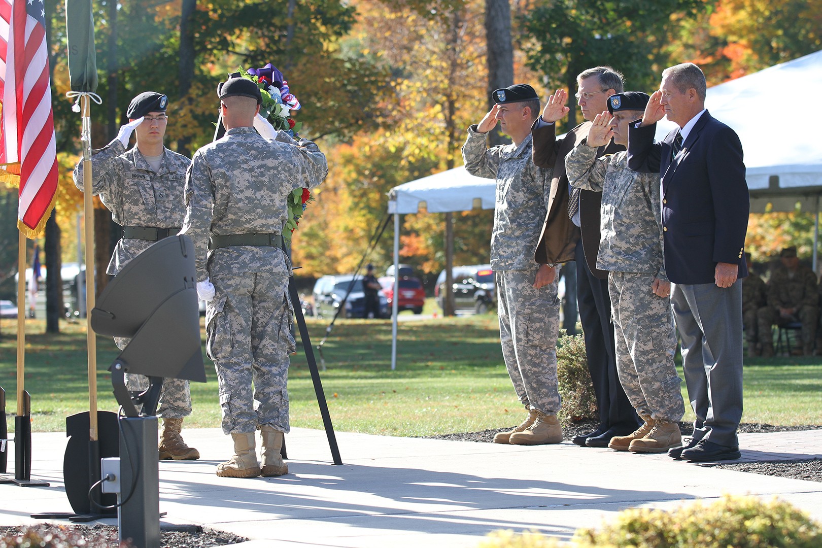 After the commanding general's remarks, those in attendance rose for the rendering of honors, the playing of taps and "Amazing Grace," and a moment of silence. Then guests and Soldiers paid their respects.
