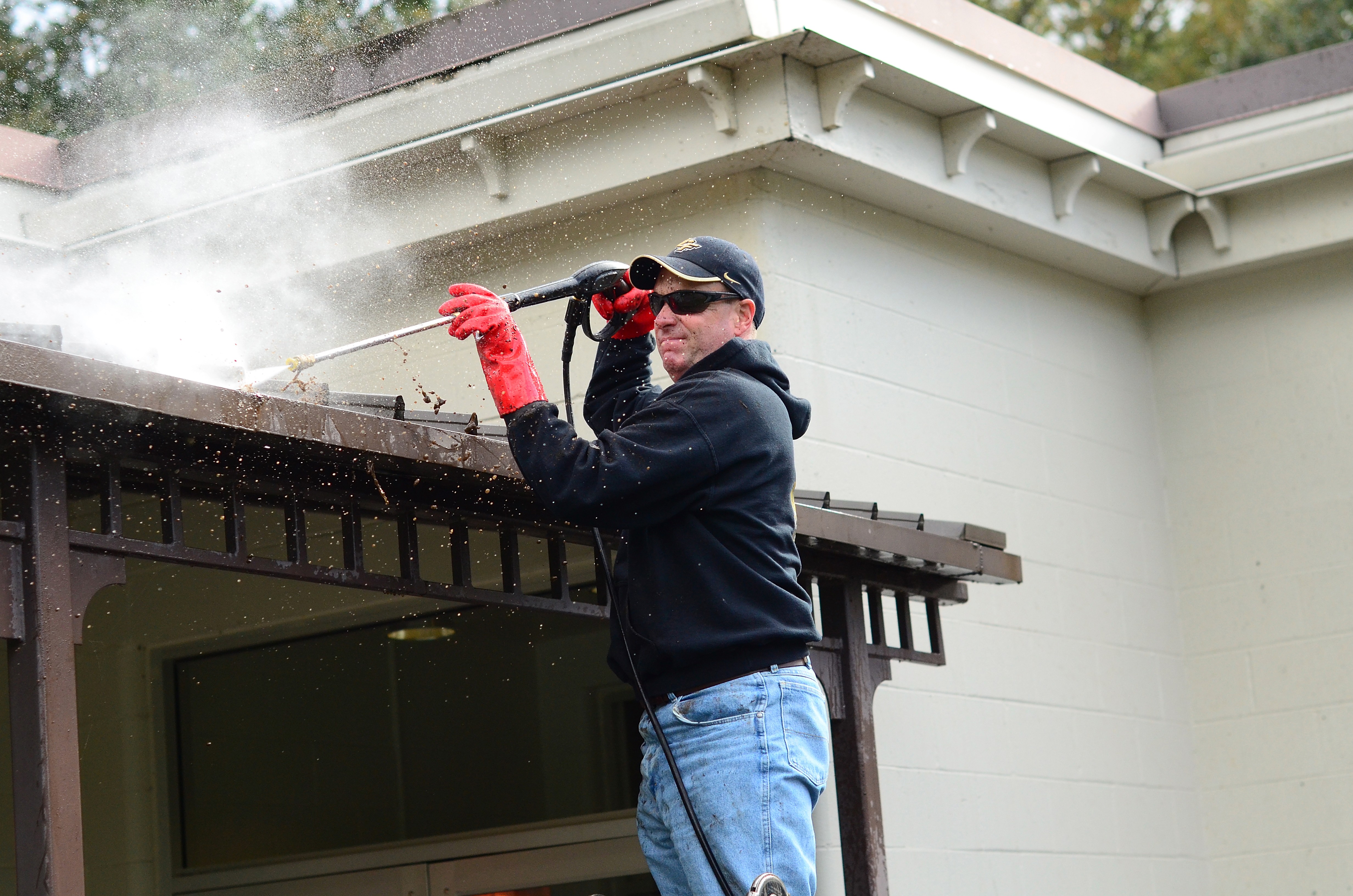 Dressed in jeans, a sweater and a University of Central Florida baseball cap, Hodges arrived at the McChord Youth Center on McChord Field about 10:30 a.m. with a ladder and pressure washer and went to work -- cleaning out the gutters above the front door and washing down the sidewalk near the entrance.