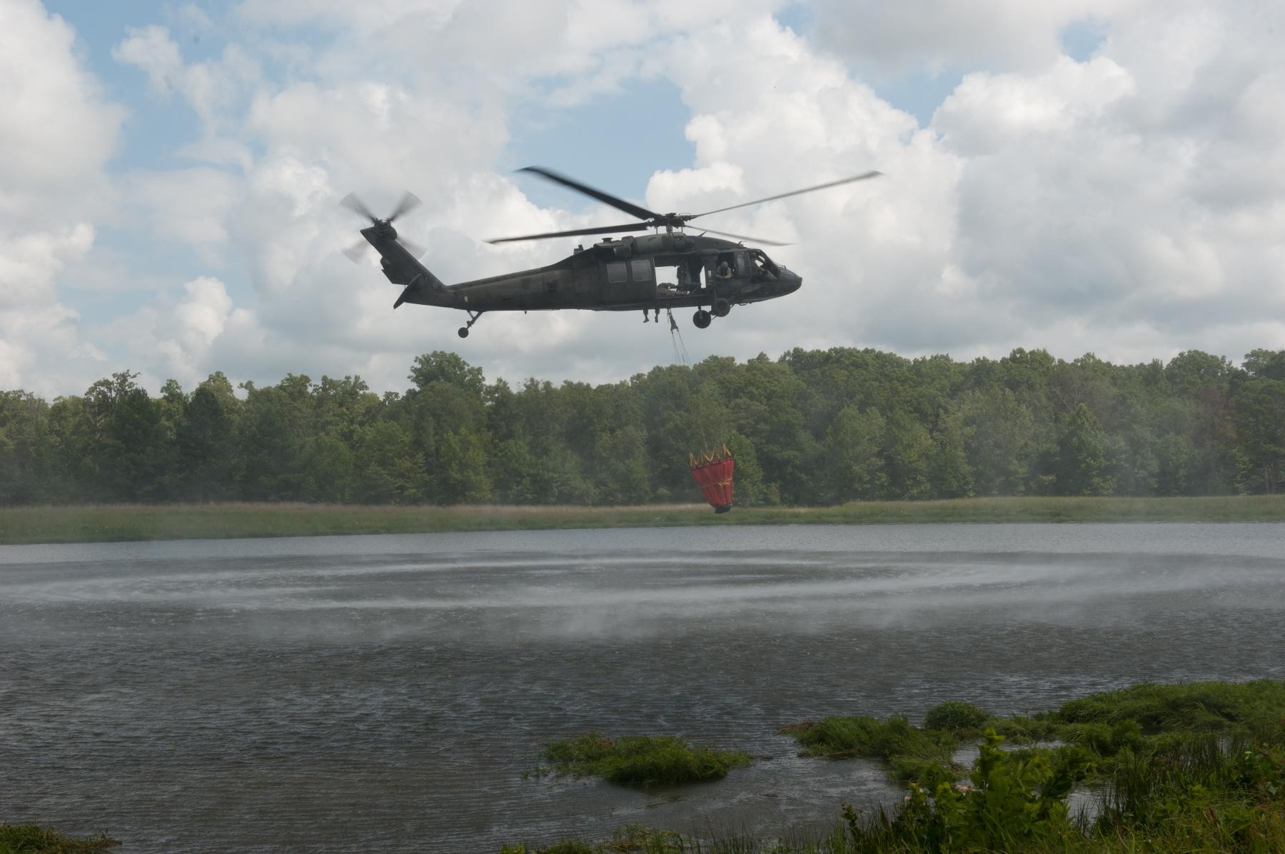 Water gets kicked up as a helicopter with A Company, 6th Battalion, 101st Combat Aviation Brigade, 101st Airborne Division (Air Assault), comes in to a hover over Lake Kyle to fill a water bucket up during wildfire training at Fort Campbell, Ky., Aug...