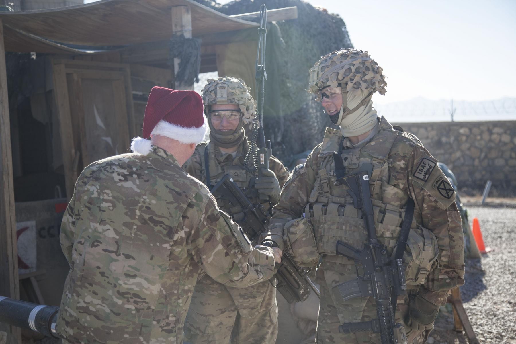 U.S. Army Capt. Michael McCawley, chaplain, spreads holiday cheer to soldiers with 4th Battalion, 25 Field Artillery Regiment, 3rd Brigade Combat Team, 10th Mountain Division, on Forward Operating Base Clark, Afghanistan Dec. 25, 2013. (U.S. Army pho...