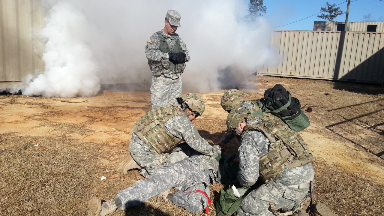 CAMP SHELBY, Miss. (March 26, 2014) -- Three Soldiers from the 3rd Battalion, 348th Regiment, were among the first to respond to an overturned 18-wheeled tractor-trailer carrying flammable material on Interstate-59 in Hattiesburg, Miss., March 11.