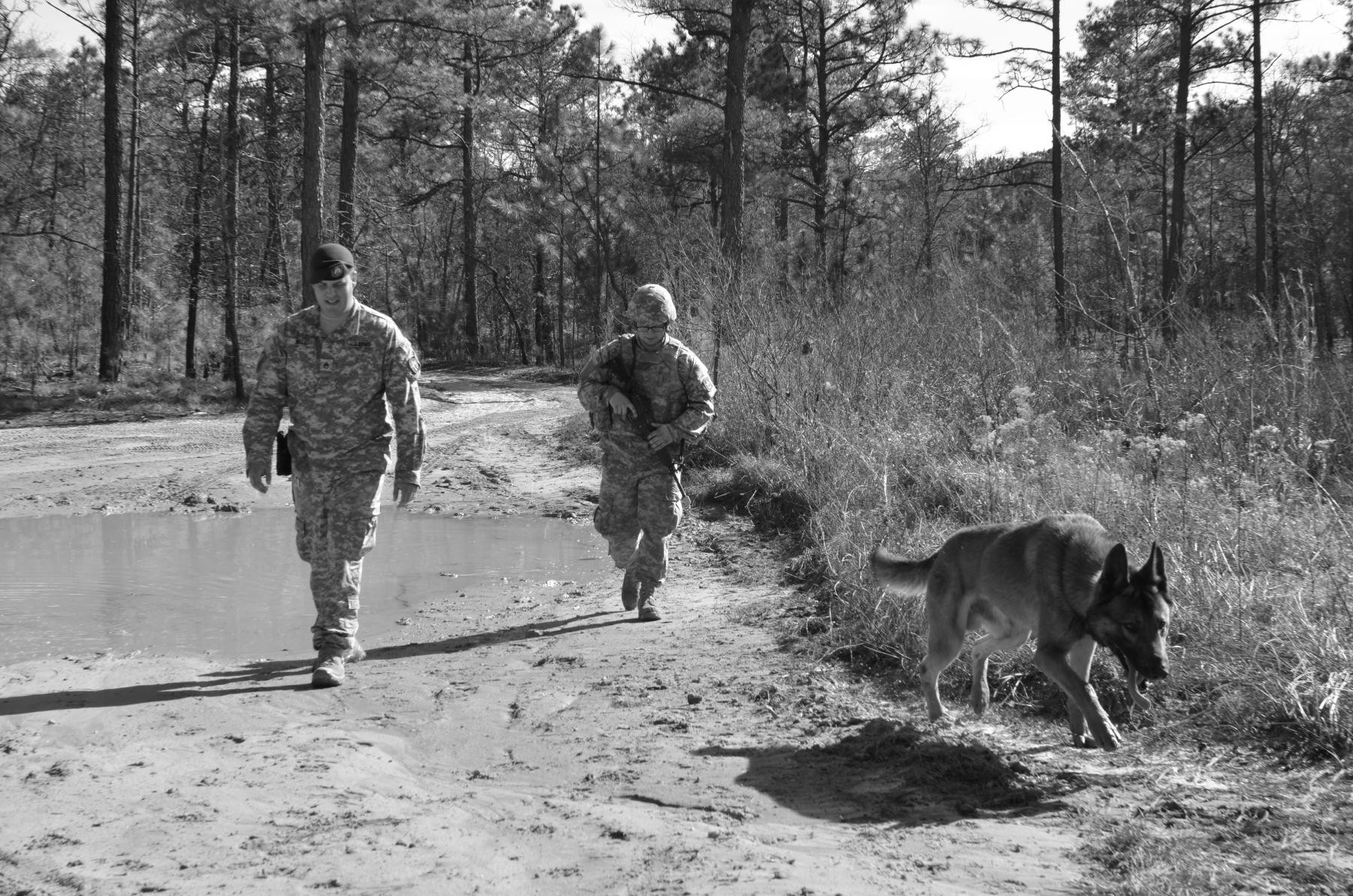 Pfc. Nicholas C. Hinderliter of Detroit and military working dog Sgt. Roger, a 2-year-old German Shepherd, both assigned to 550th Military Working Dog Detachment, 503rd Military Police Battalion, 16th MP Brigade, Fort Bragg, search for explosives alo... (Photo Credit: U.S. Army) VIEW ORIGINAL