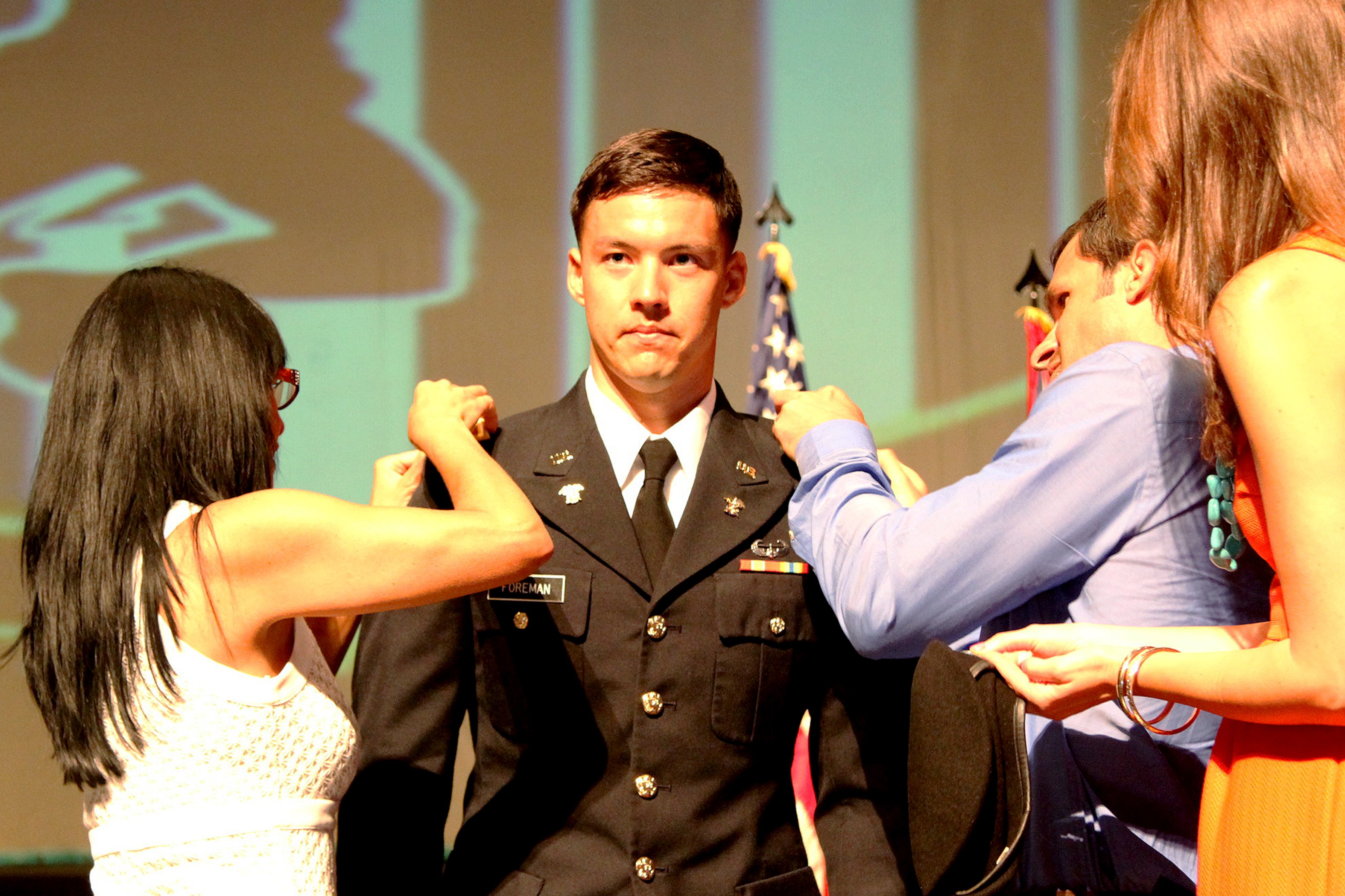 HONOLULU—2nd Lt. Dylan Foreman gets his rank pinned on him by his family during the University of Hawaii at Manoa's 104th Reserve Officer Training Corps commencement ceremony at the Kennedy Theatre May 19. Foreman was awarded the "Mamakakaua O ...