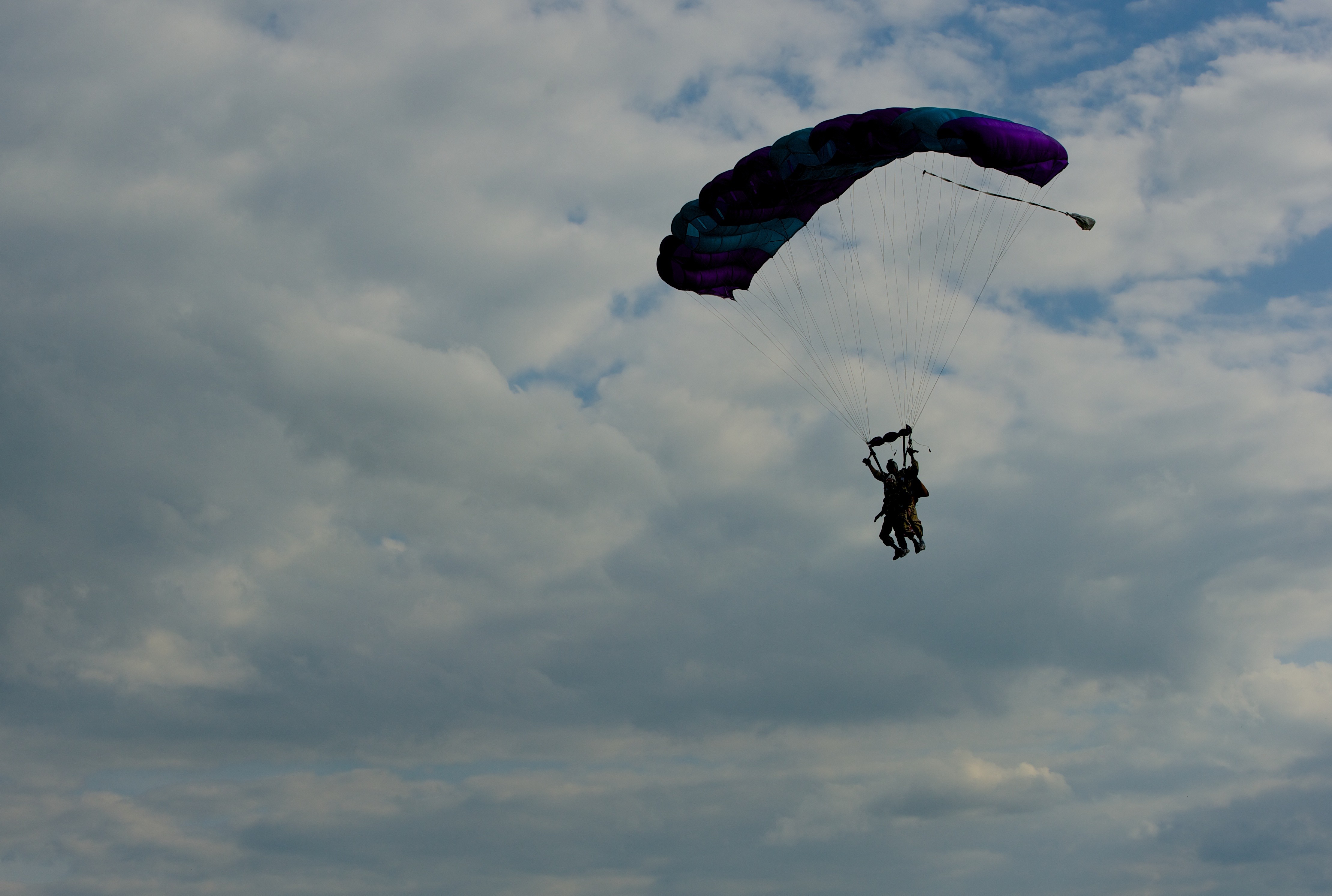 A veteran of the elite 506th Parachute Infantry Regiment, wearing his vintage tan paratroop jacket with jump wings and patches, Martin caught his breath and seemed surprised the flight was already over after sliding to a smooth landing.
