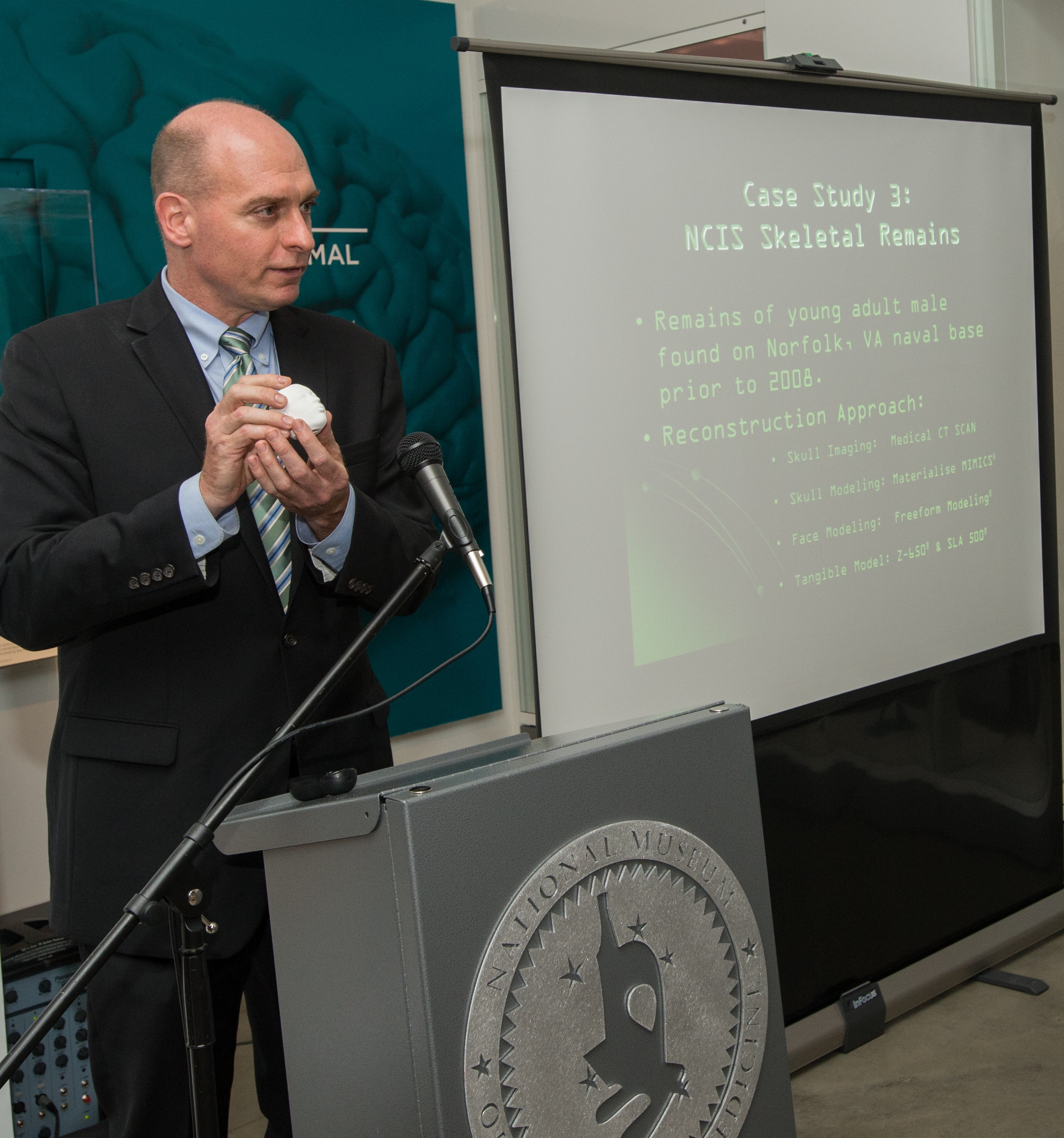 The discussion, entitled "The Science and Art of Forensic Facial Reconstruction," was led by Shayne Kondor, senior medical modeling engineer and consultant to the Naval Postgraduate Dental School in Bethesda, Maryland. He explained how 3-D modeling of craniofacial reproductions is done and illustrated both the classic approach that includes a clay sculpture over a skull, to the more cutting-edge digital approach involving optical or laser surface scan.
