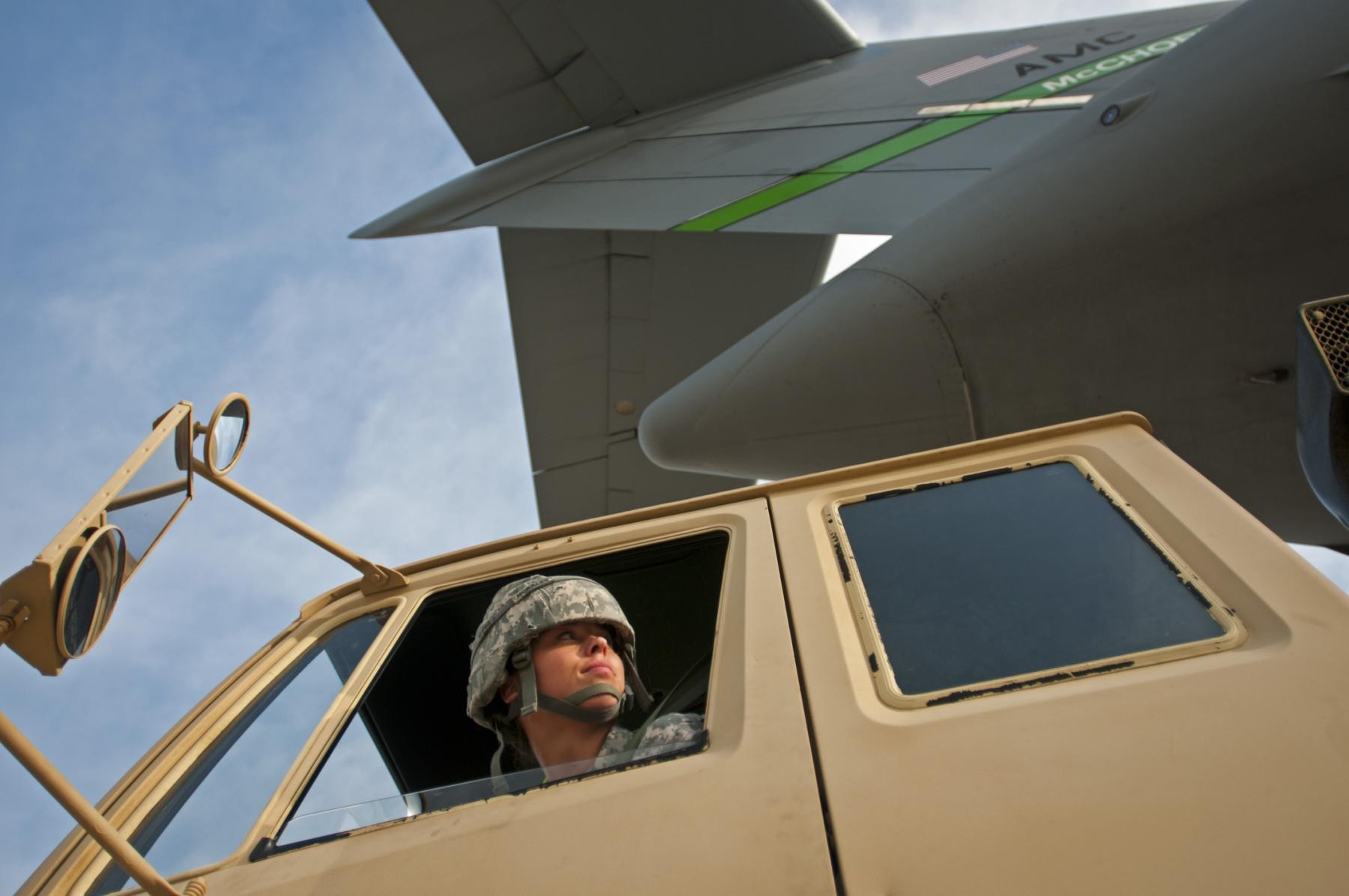 U.S. Army Pfc. Jennifer Morales, an image analyst with Headquarters and Headquarters Battalion, III Corps, who is from Las Vegas, backs her Light Medium Tactical Vehicle into a C-17 Globemaster at the Bob Gray Army Airfield on Fort Hood, June 24, 201... (Photo Credit: U.S. Army) VIEW ORIGINAL