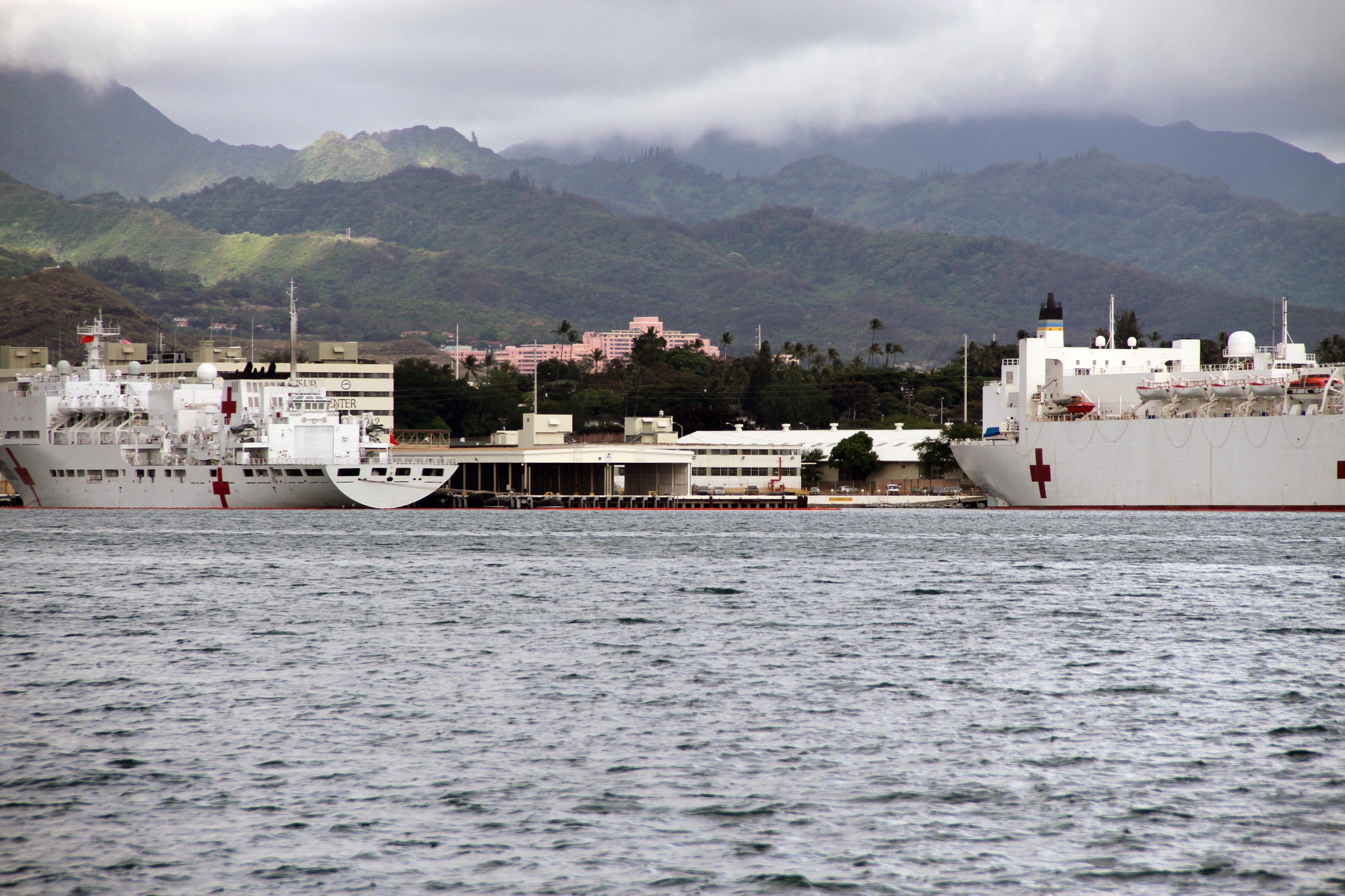 Tripler Army Medical Center (TAMC) sits atop the Moanaloa Ridge nestled between U.S. hospital ship USNS Mercy (right) (T-AH 19) and Chinese People's Liberation Army Navy (PLA(N)) hospital ship Peace Ark (left) (T-AH 886) as seen from the shore at Ford Island. Both ships are in Pearl Harbor taking part in Rim of the Pacific (RIMPAC) on July 11, 2014. TAMC took part in the Humanitarian Assistance and Disaster Relief Medical Response portion of the exercise.