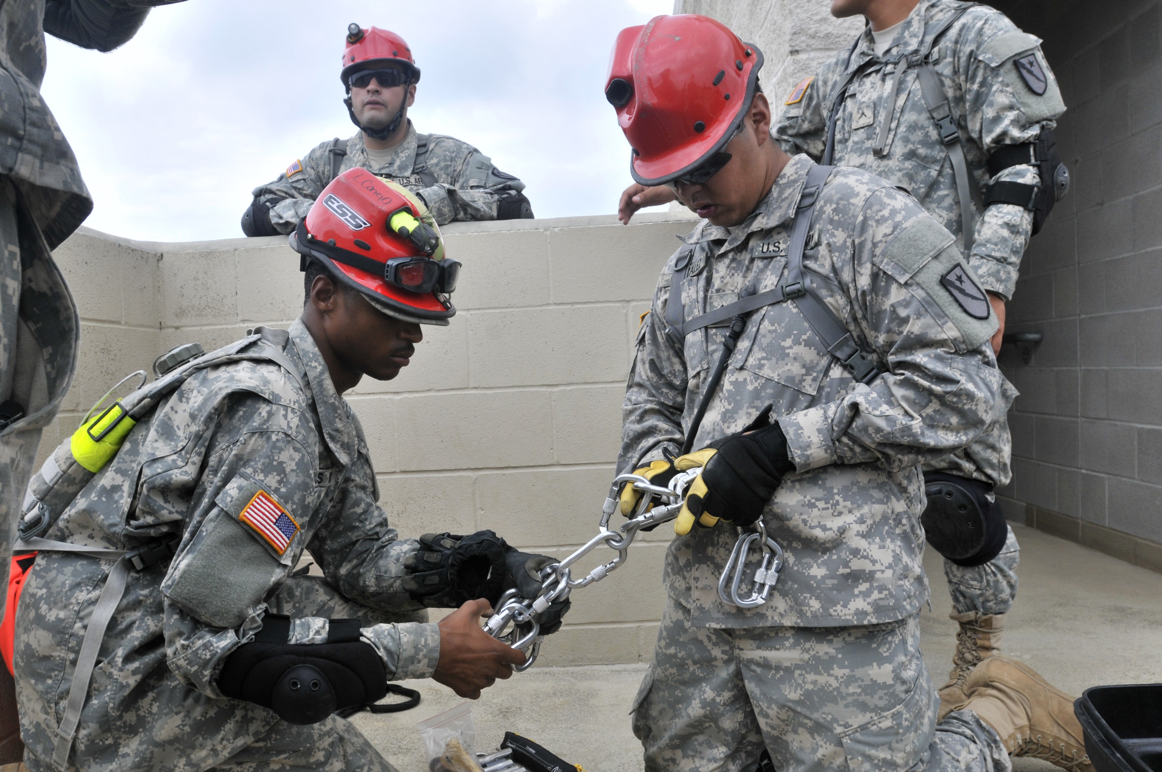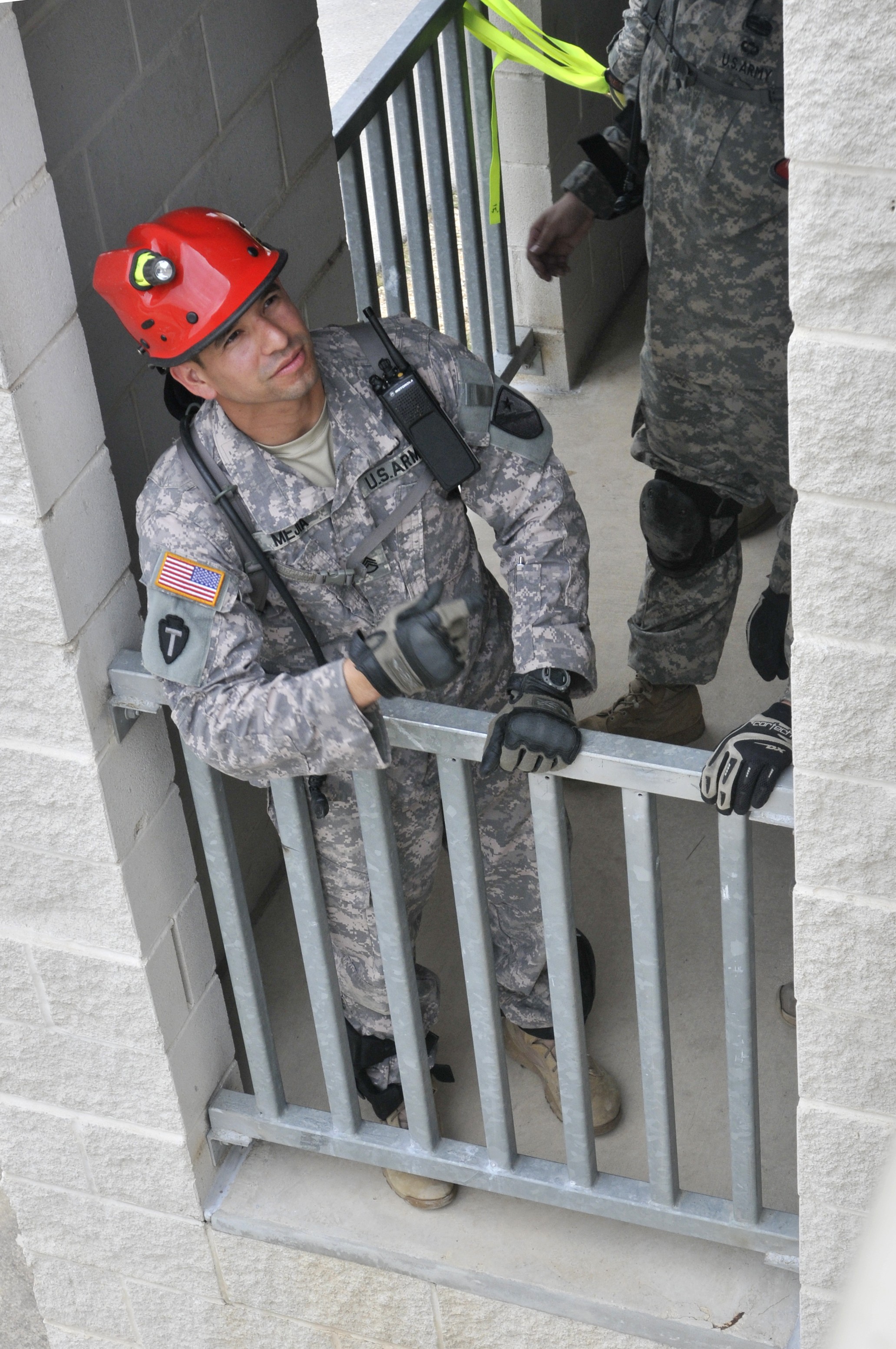Following these maneuvers, the engineers practiced the life-saving rescue drills associated with their role as a contributor to the FEMA Region VI Homeland Response Force mission. During the day-long collective exercise held July 17 that included their battalion headquarters and the Austin Fire Department's Special Operations team, they practiced their extraction techniques, rappelling, and civil authority cooperation.