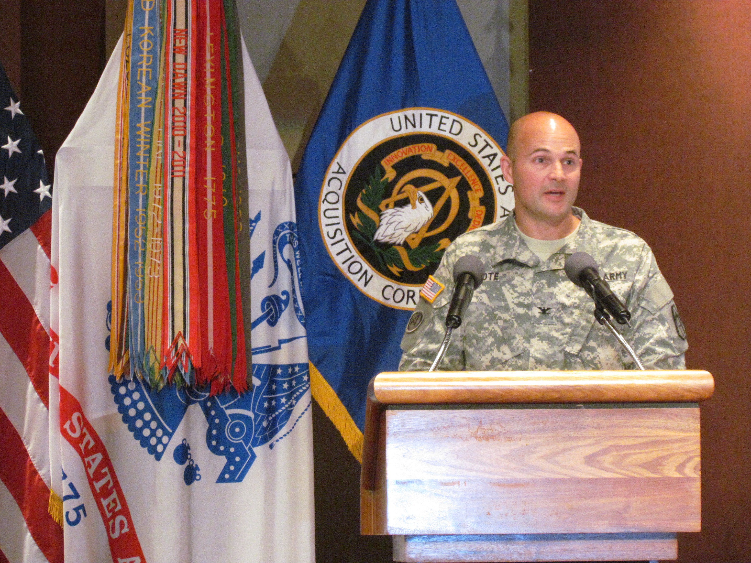 During a change of charter ceremony July 11 in a nearly full Bob Jones Auditorium, Cote took the helm as the project manager of the Unmanned Aircraft Systems Project Office, Program Executive Office for Aviation. He replaces Col. Tim Baxter, who is returning to the Special Operations Command as the military deputy to the acquisition executive at McDill Air Force Base in Tampa, Florida.