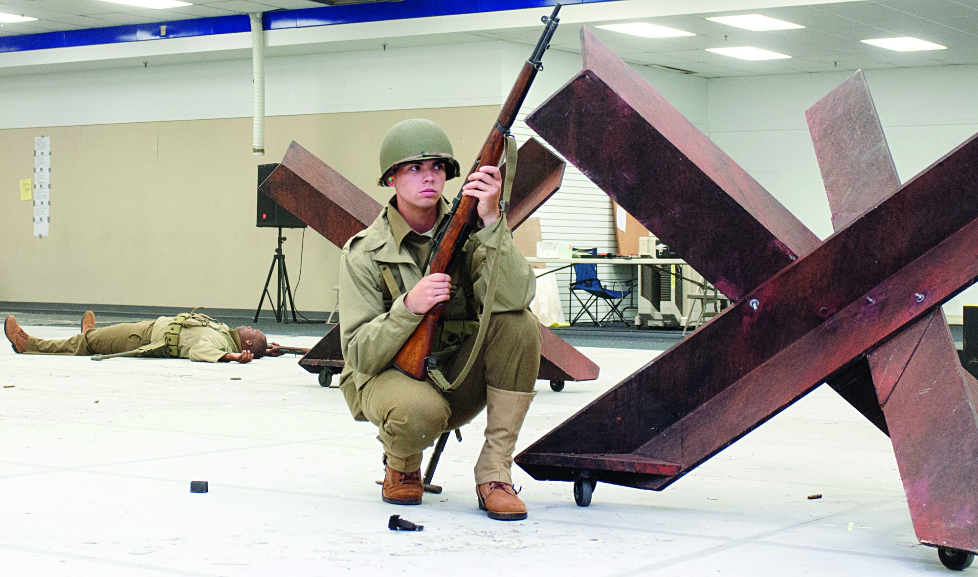 Making use of the space in the former Post Exchange building, Soldiers used props and set up displays for Spirit of America rehearsals which lasts until the production goes on the road in September to Albany, New York, Boston and Hershey, Pa. The show uses more than 300 active-duty Soldiers from the U.S. Army Military District of Washington to participate in the performance.