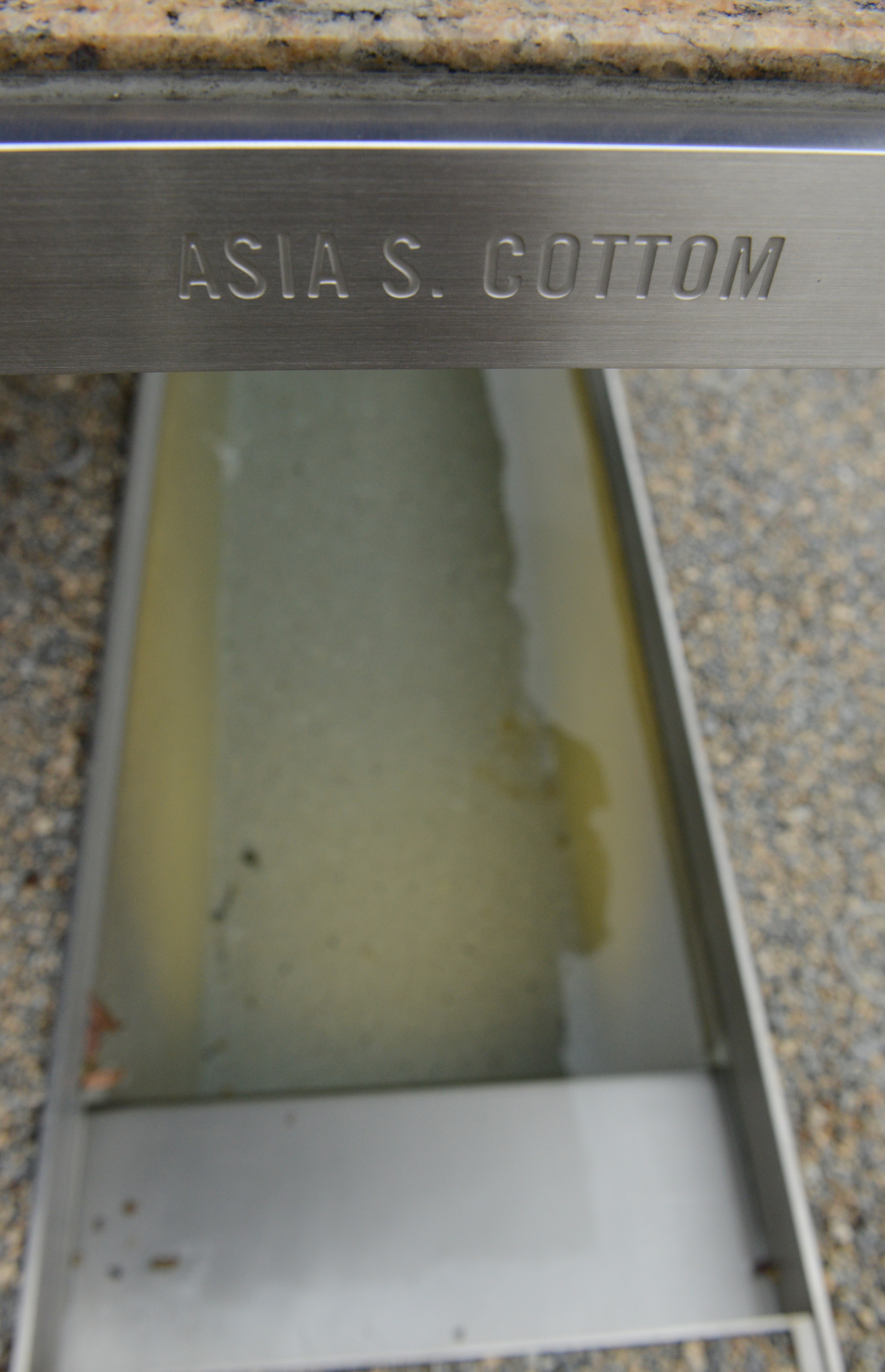 Beneath each memorial bench is running water in a small pool, and each memorial bench has the person's name etched on the front. Asia's memorial is one of the first one visitors encounter as they enter the area.