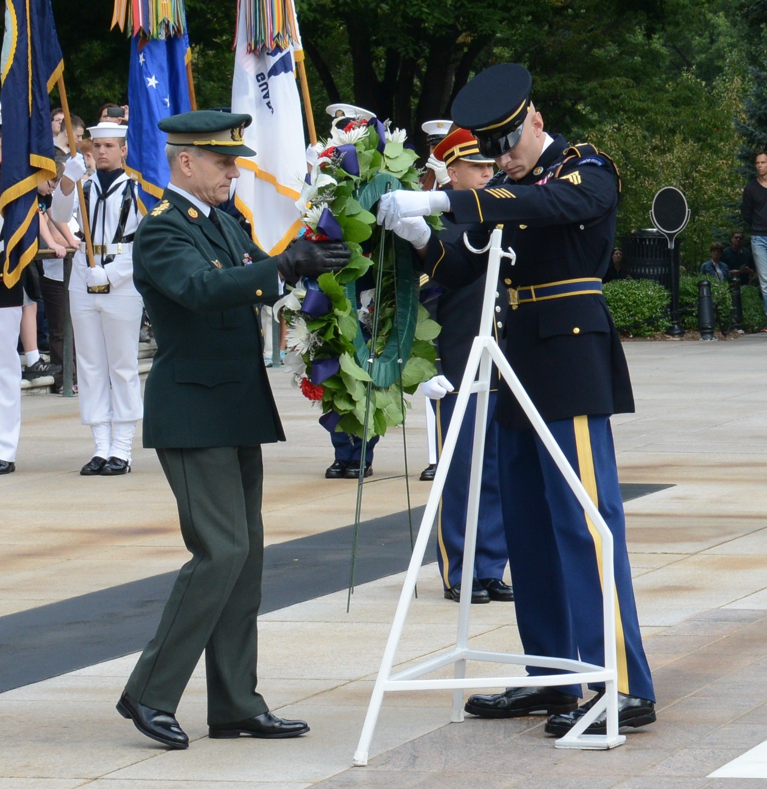 ARLINGTON, Va. (Oct. 2,2014) - Danish Gen. Knud Bartels, Chairman of the Military Committee of the North Atlantic Treaty Organization (NATO), paid his respects to America's fallen heroes during an Armed Forces Full Honors Wreath Laying ceremony with Maj. Gen. Jeffrey S. Buchanan, Joint Force Headquarters-National Capital Region/U.S. Army Military District of Washington commanding general, at the Tomb of the Unknown Soldier in Arlington National Cemetery, Va.