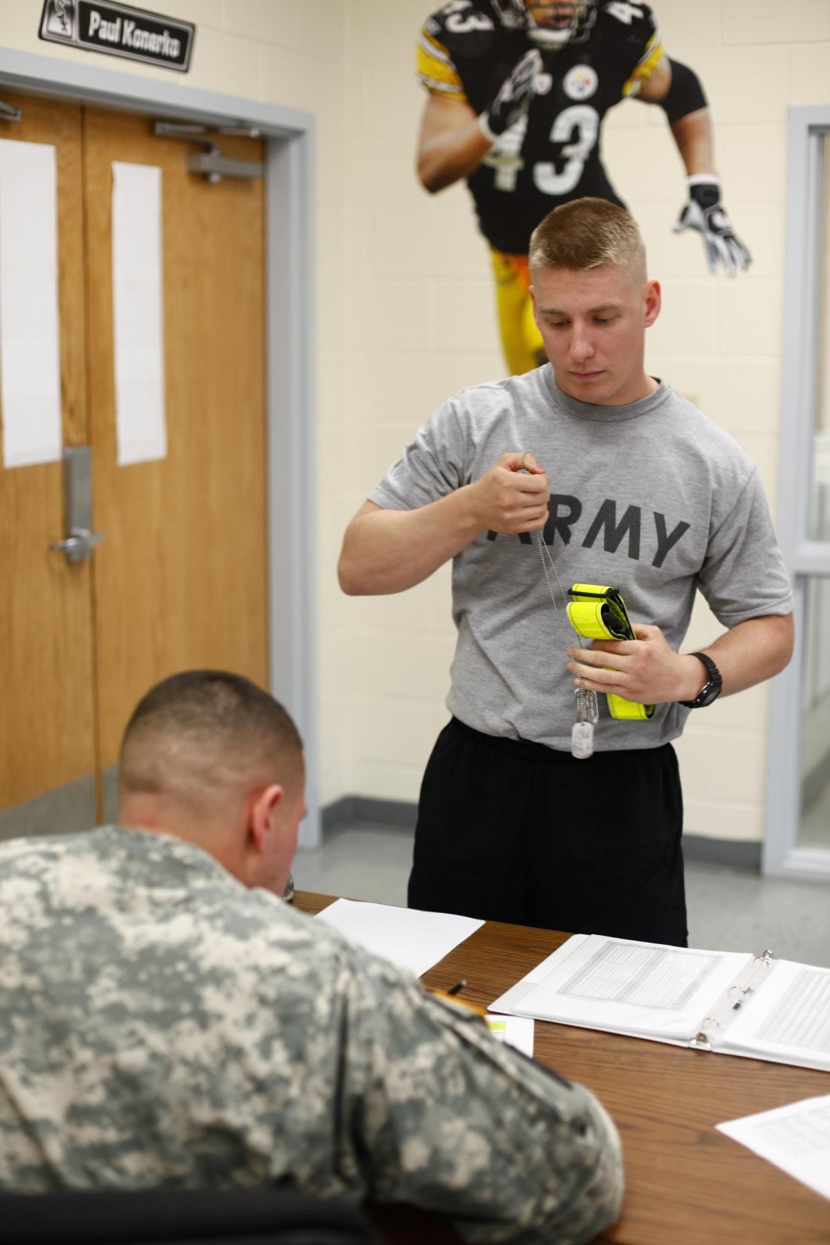 U.S. Army Sgt. Nicholis Couture starts the height, weight and tape portion of the 2014 Department of the Army Best Warrior Competition (BWC) at Fort Lee, Va., Oct. 6, 2014. The BWC is an annual Army competition that tests a Soldier's mental, physical...