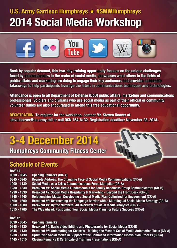 CAMP HUMPHREYS -- The U.S. Army Garrison Humphreys Public Affairs Office is again offering a Social Media Workshop, Dec. 3-4, in the Humphreys Community Fitness Center (Conference rooms A, B & C).