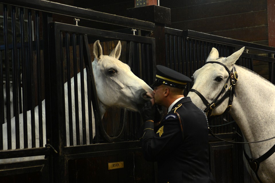 Soldiers say "hello", nuzzle and pet the horses. Some of the animals can be cranky; it's still early and the golden rays of dawn have not yet broken through the dark sky.