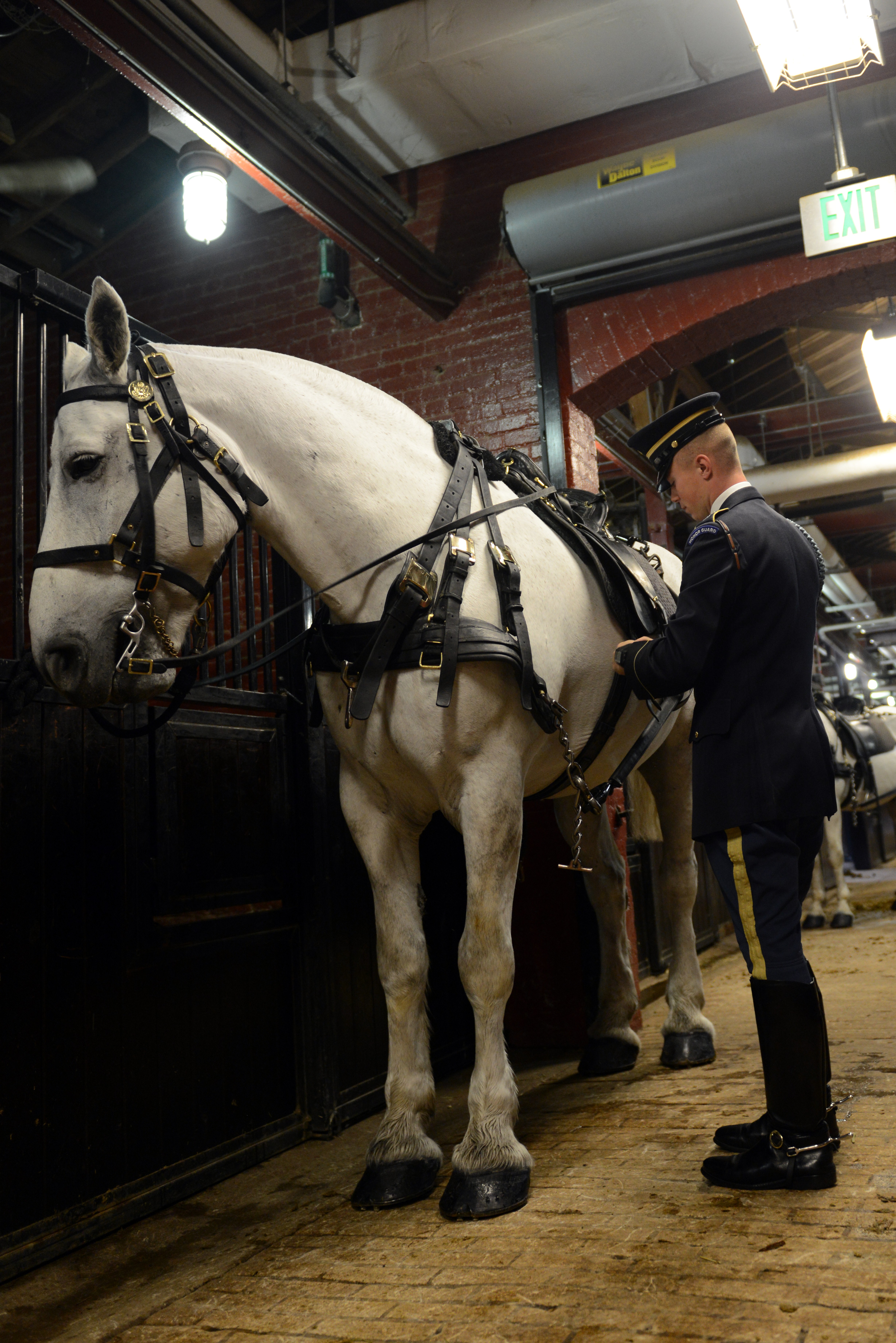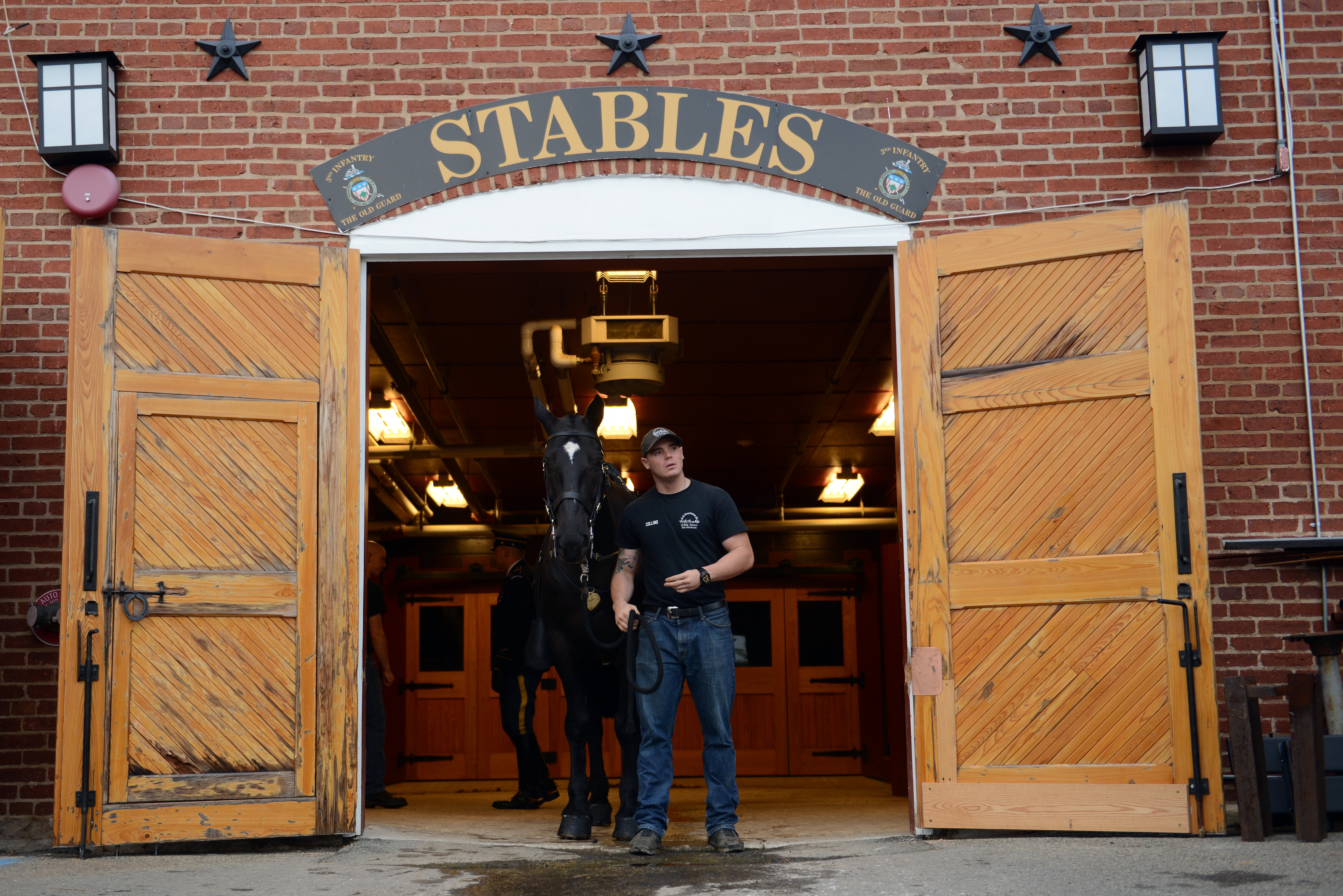 Soldiers switch during the week between being the stable crew and being on the riding team. The horses switch as well, to allow for the animals to get some R&R in the stables and meet visitors who stop by during the public hours in the afternoon.