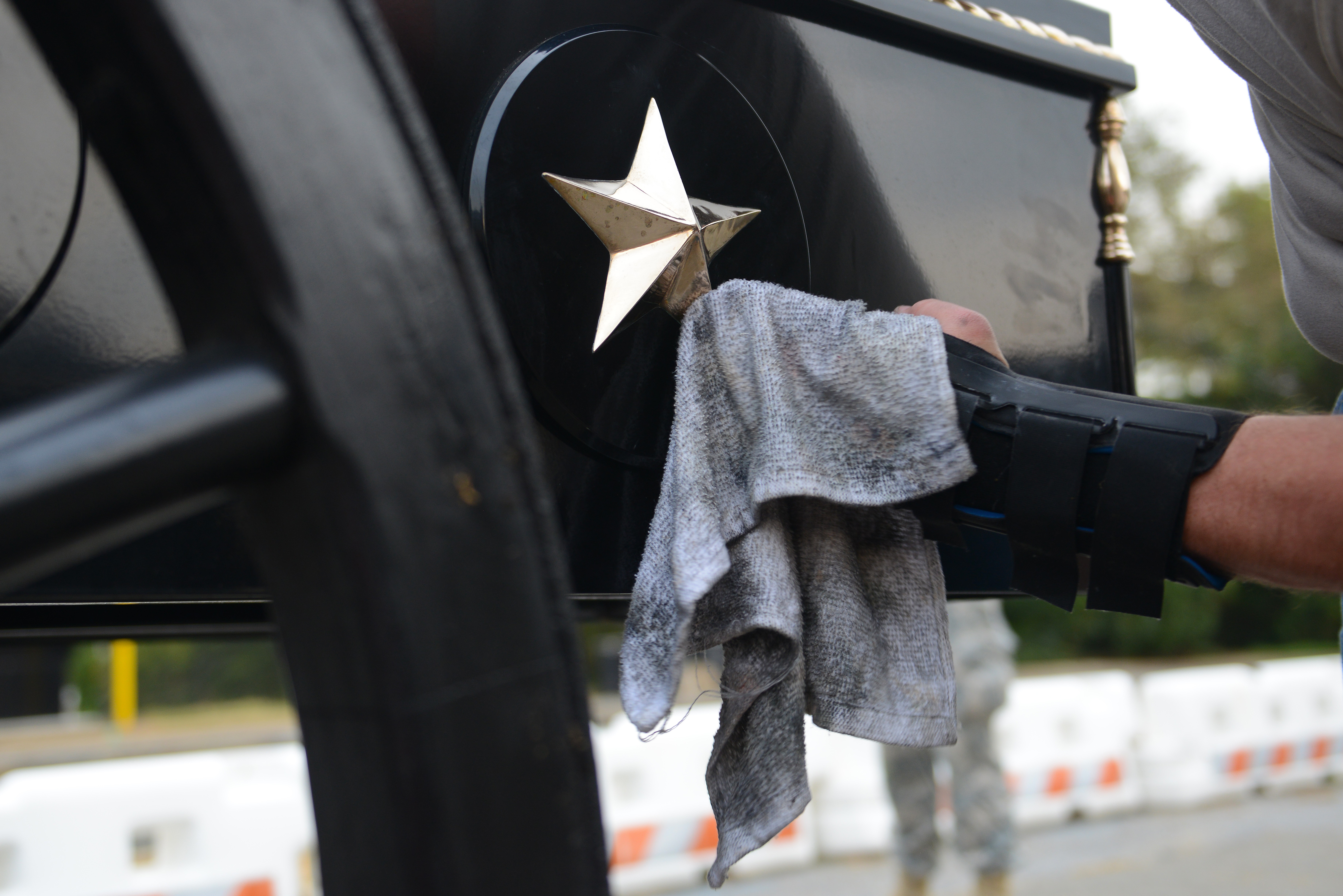 A ribbon rack on a Soldier's uniform is straightened. Brass stars are polished to perfection on the caisson wagon.