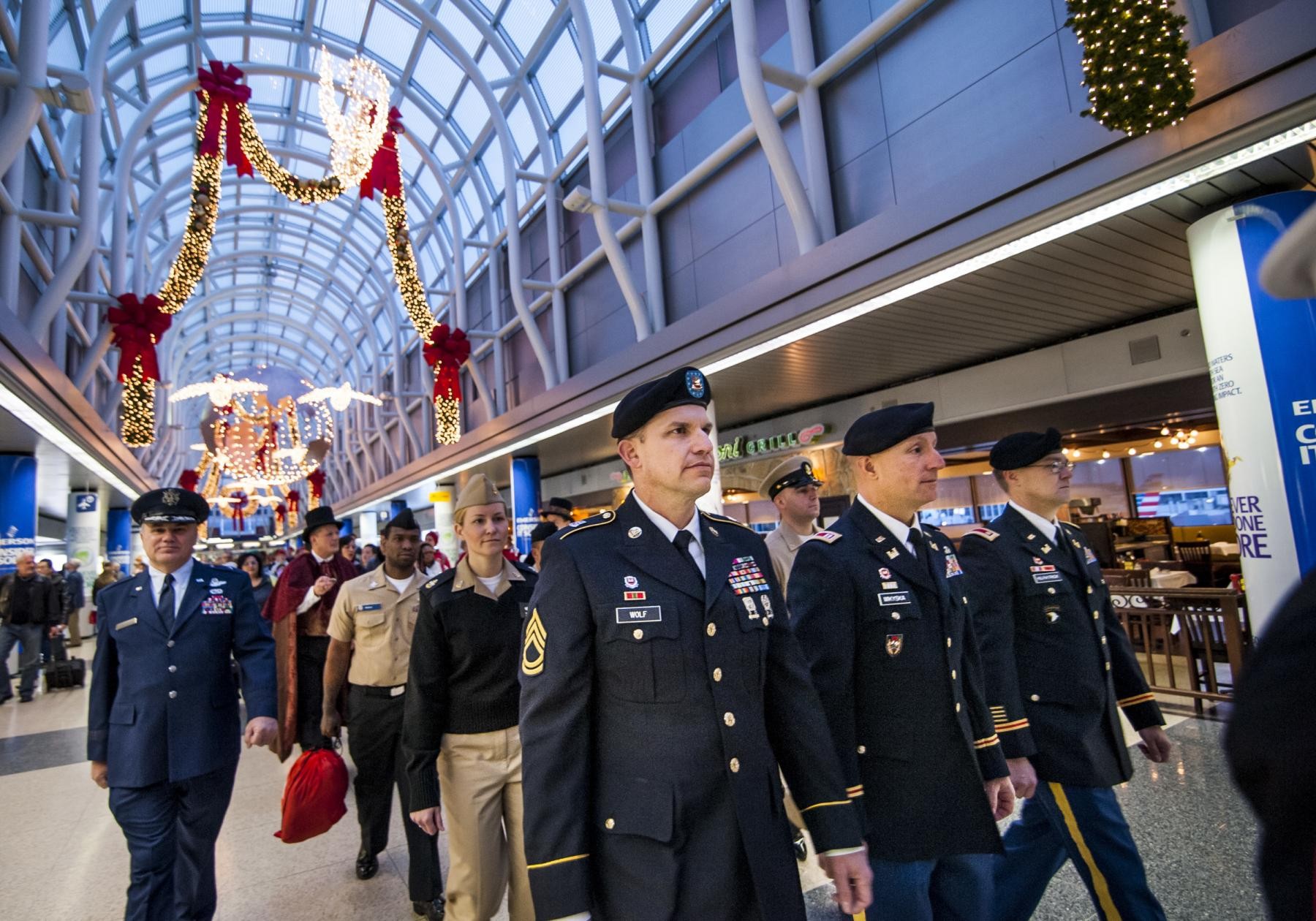DARIEN, Ill. - They marched in unison through the airport corridor, keeping in step, not to a military cadence, but to the joyful music of Christmas carolers.