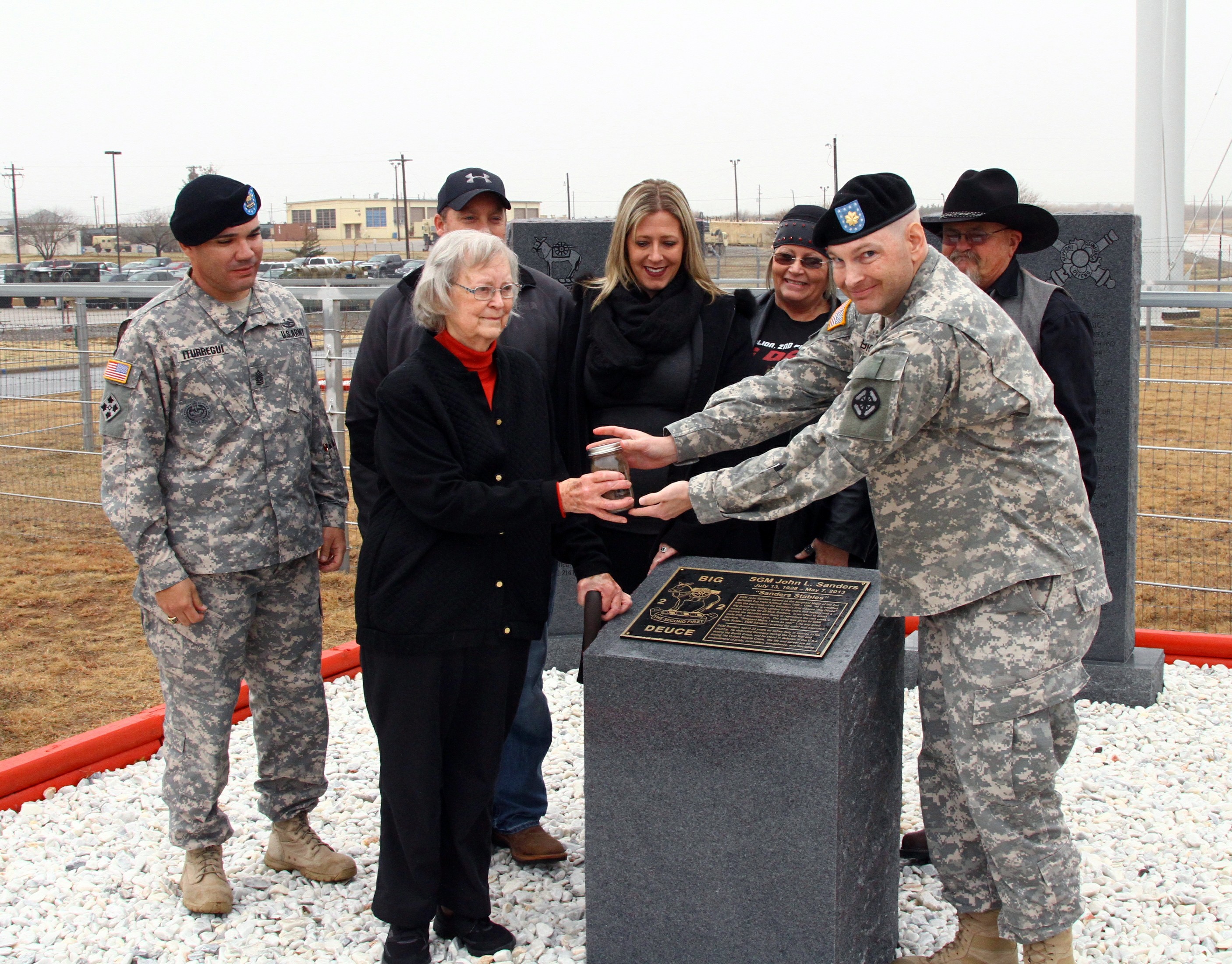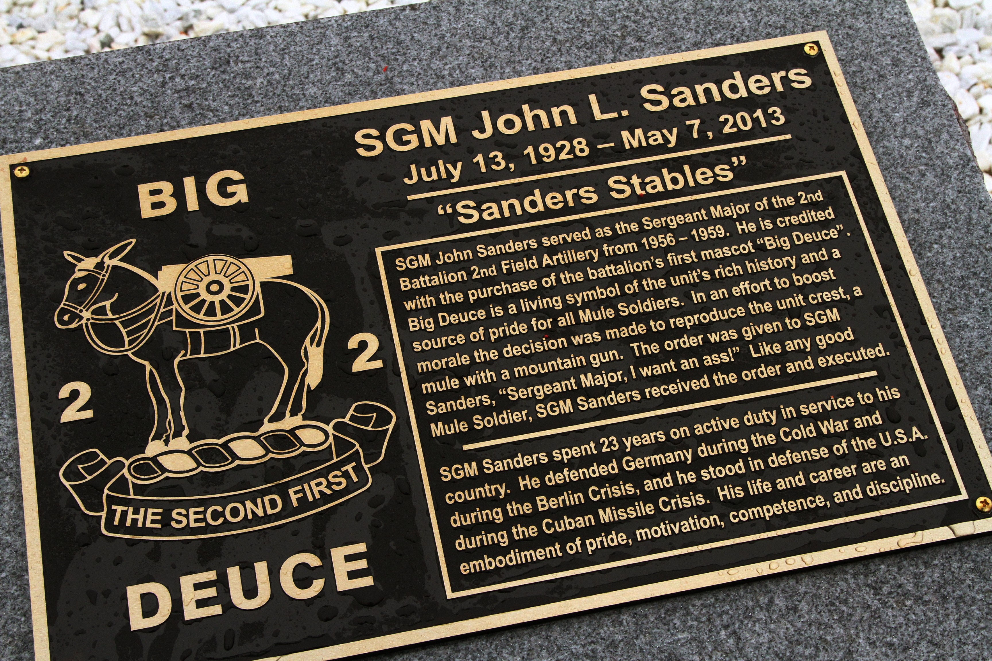 Members of the Sanders family attended the event which was hosted by 2nd Battalion, 2nd Field Artillery "Big Deuce." On the grounds, a memorial honors the heritage of 2-2nd FA, its mascots and the sergeant major.