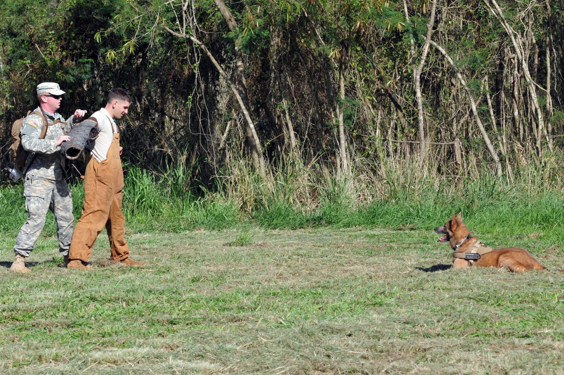 Overseeing the certification, Master Sgt. William Etheridge, MWD program manager, Headquarters and Headquarters Battalion, U.S. Army Pacific, said that in addition to being able to work cohesively as a team, the K-9s must demonstrate detection proficiency in five different areas.