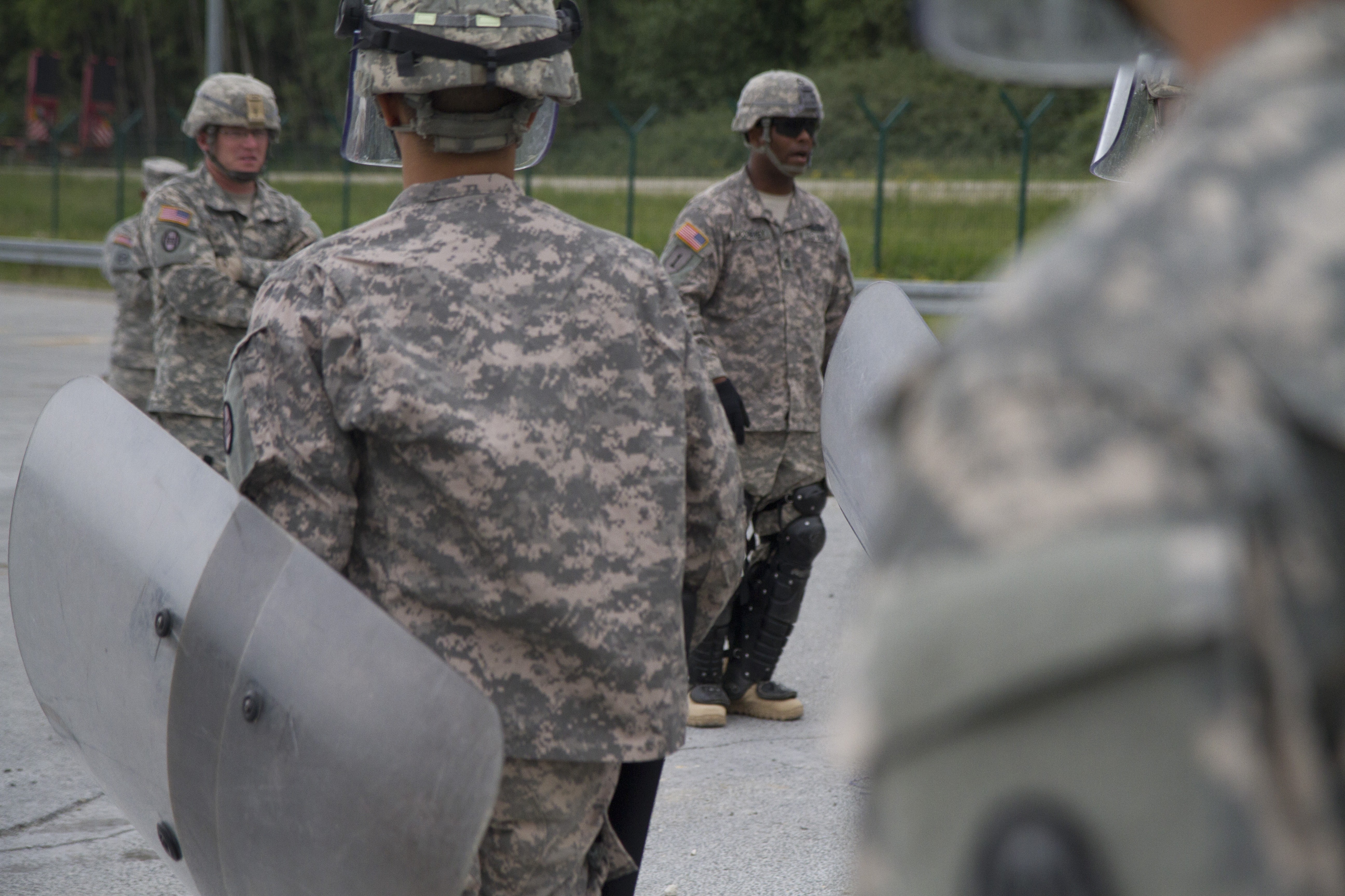 Led by the military police of the Slovenian Armed Forces, 1st Battalion 252nd Armor Regiment's Alpha Company began initial training exercises for crowd and riot control. Included in the exercise was a team of guest observers from Fort Bliss, Texas, to assist the units in the training rotation to better understand the core processes for CRC.