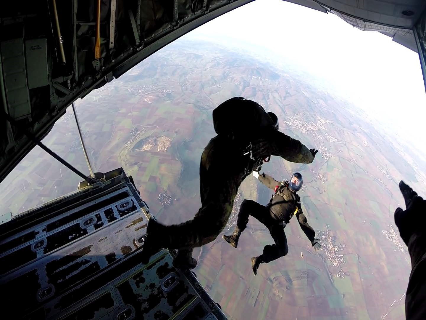 German paratroopers exit the aircraft during Toy Drop 2015. The 5th Quartermaster Theater Aerial Delivery Company conduct their annual toy drop as an international jump and foreign wing exchange. Members of eight allied nations participated in the ev...