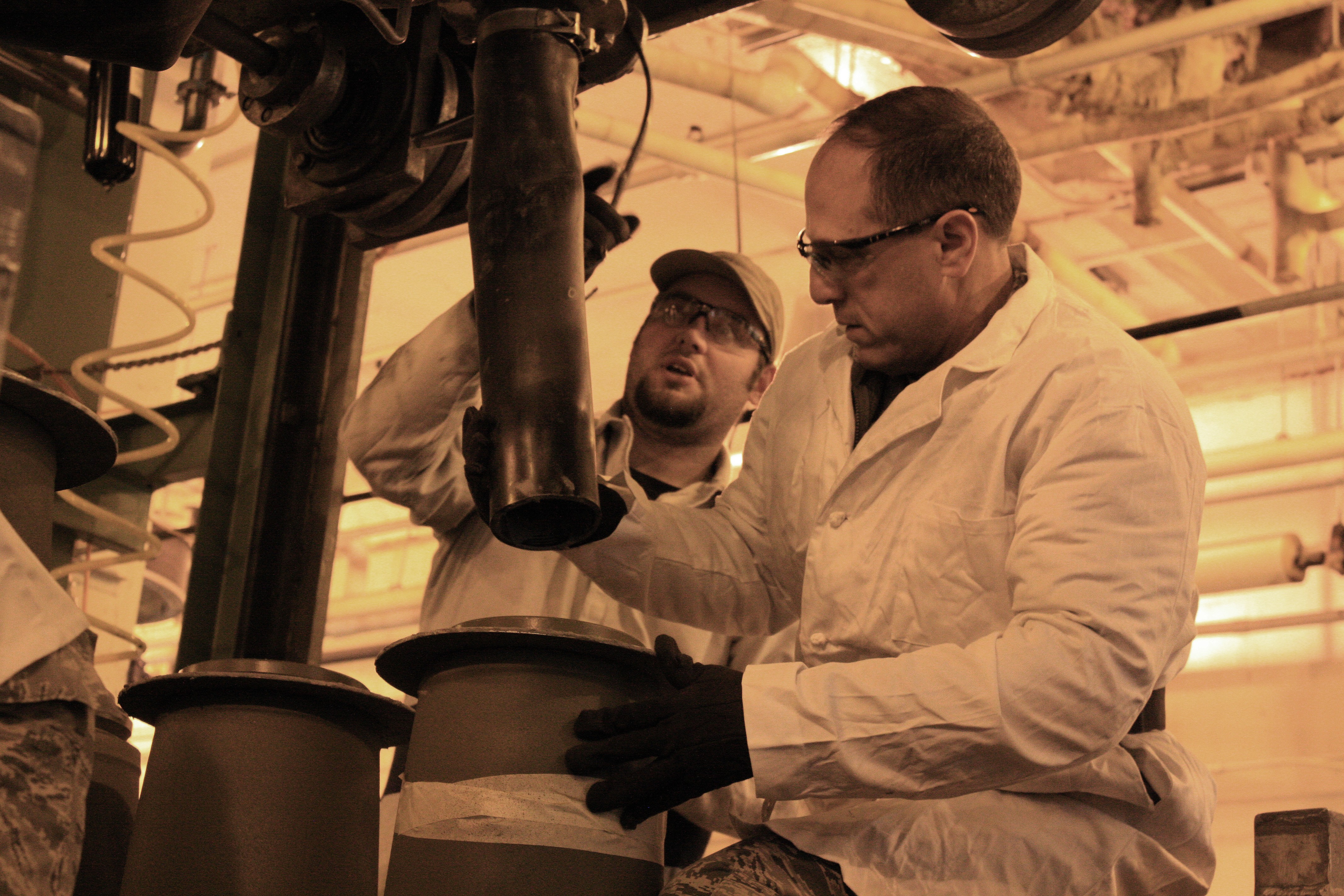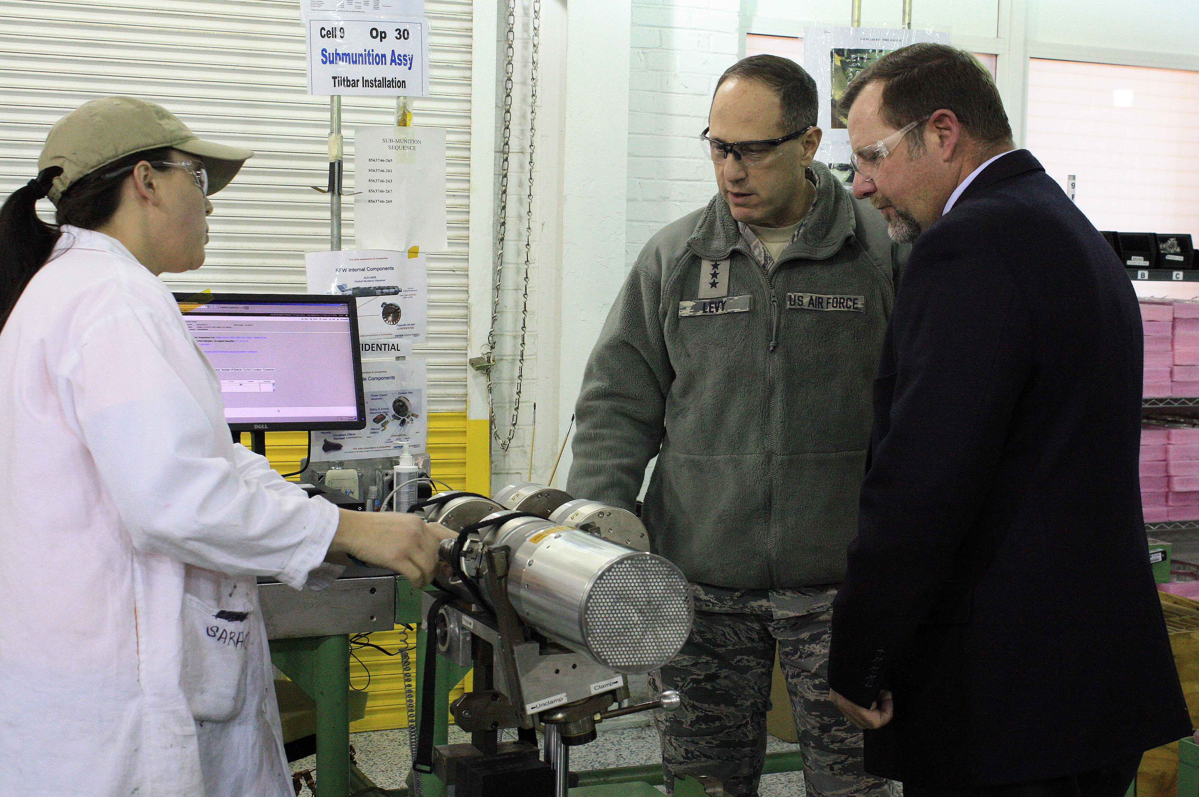 The majority of the time was devoted to a tour of bomb preparation and explosive mix facilities, where Levy and Chief Master Sgt. Jason France each filled one BLU-111 500-pound, general purpose bomb. They also visited the newest explosive mix facility, which produces Air Force bombs, the plant's largest outload pad, and the CBU-105 Sensor Fuzed Weapon integration facility.