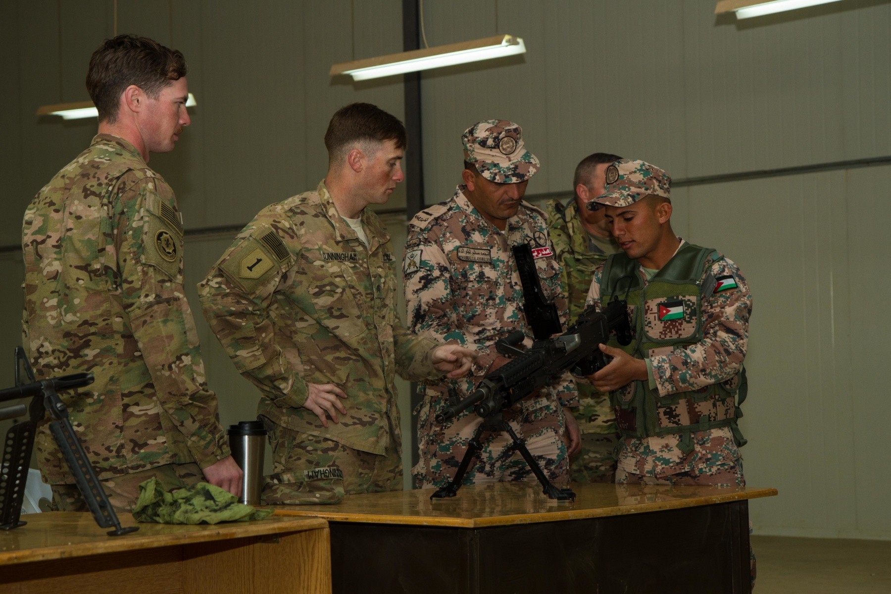 Over the duration of the training, Soldiers of B Troop, 5-4 Cavalry, worked side-by-side with members of the Jordanian Border Guard to build comradery and increase proficiency on various small-arms weapons through classroom training and live-fire exercises.