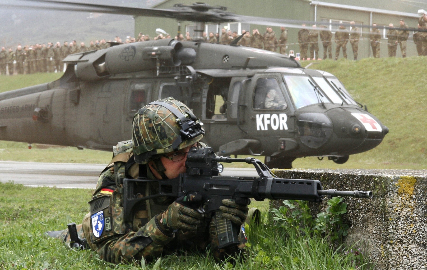 A German Soldier pulls security for a U.S. Army medevac helicopter March 27, in Prizren, Kosovo. The German Armed Forces from Kosovo Force and NATO, demonstrated their security and medevac capabilities in front of a multinational crowd during German ...