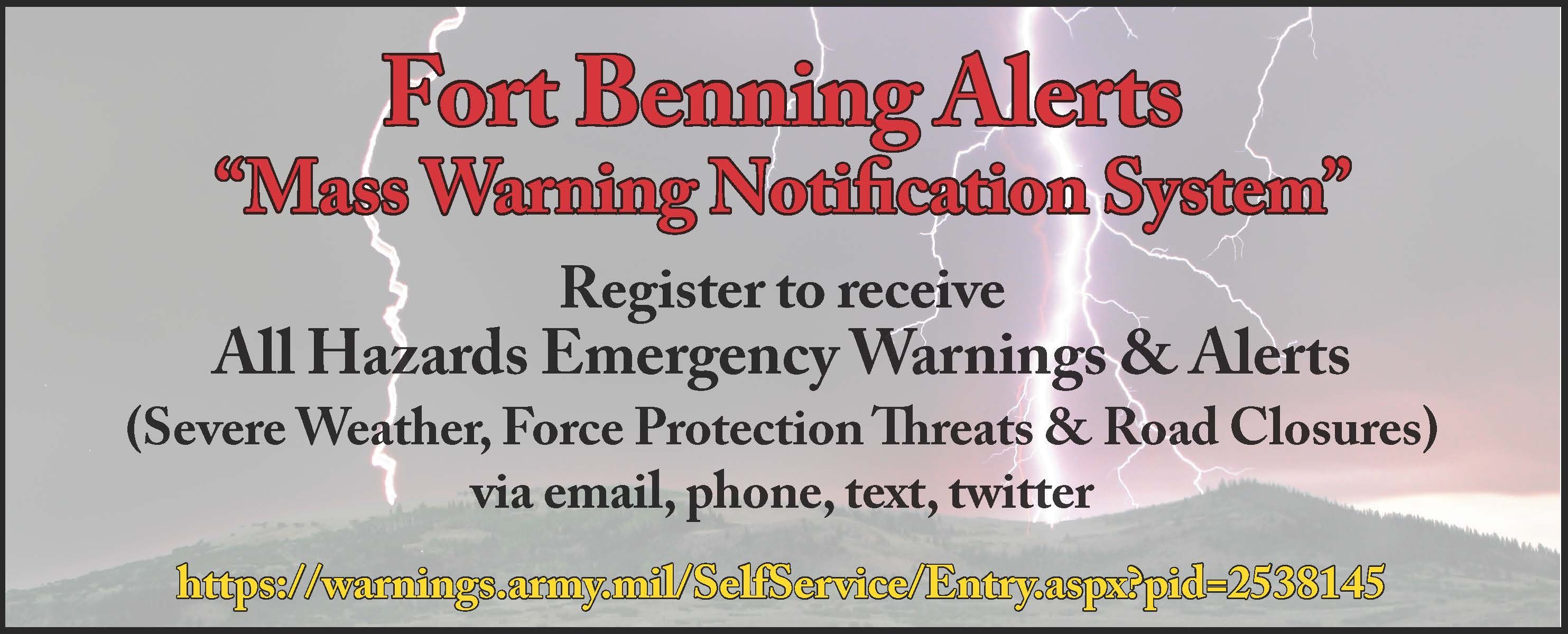 Fort Benning also uses the AtHoc Emergency Alerts as part of the Mass Warning and Notification System to notify installation units, organizations and civilians of severe weather. CAC holders can register on their work computers while non-CAC holders can visit https://warnings.army.mil/SelfService/2538145 to register their selected devices to receive the alerts.