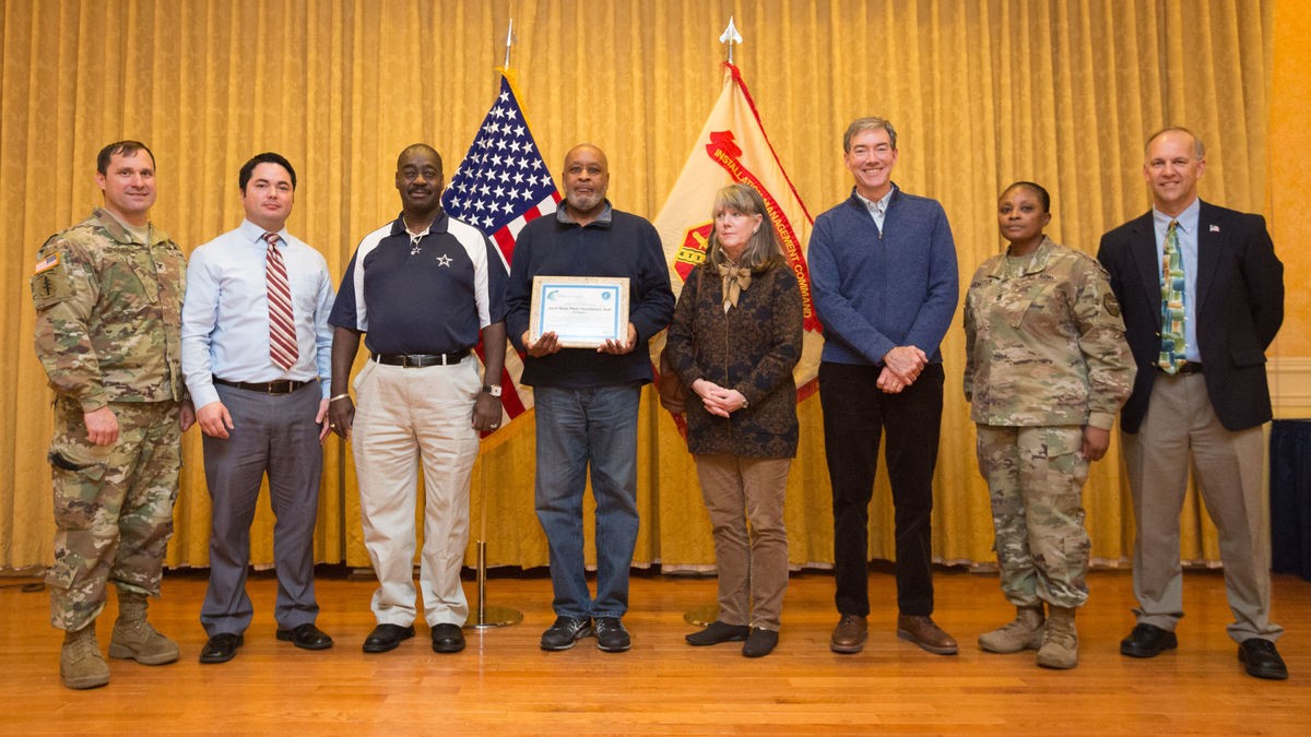 The award was presented by Joint Base Commander Col. Patrick M. Duggan to members of the Directorate of Public Works' Environmental Management Division, comprised of Mark Luckers, Roy Croom, Kristie Lalire, Greg Olmsted and Richard P. LaFreniere.