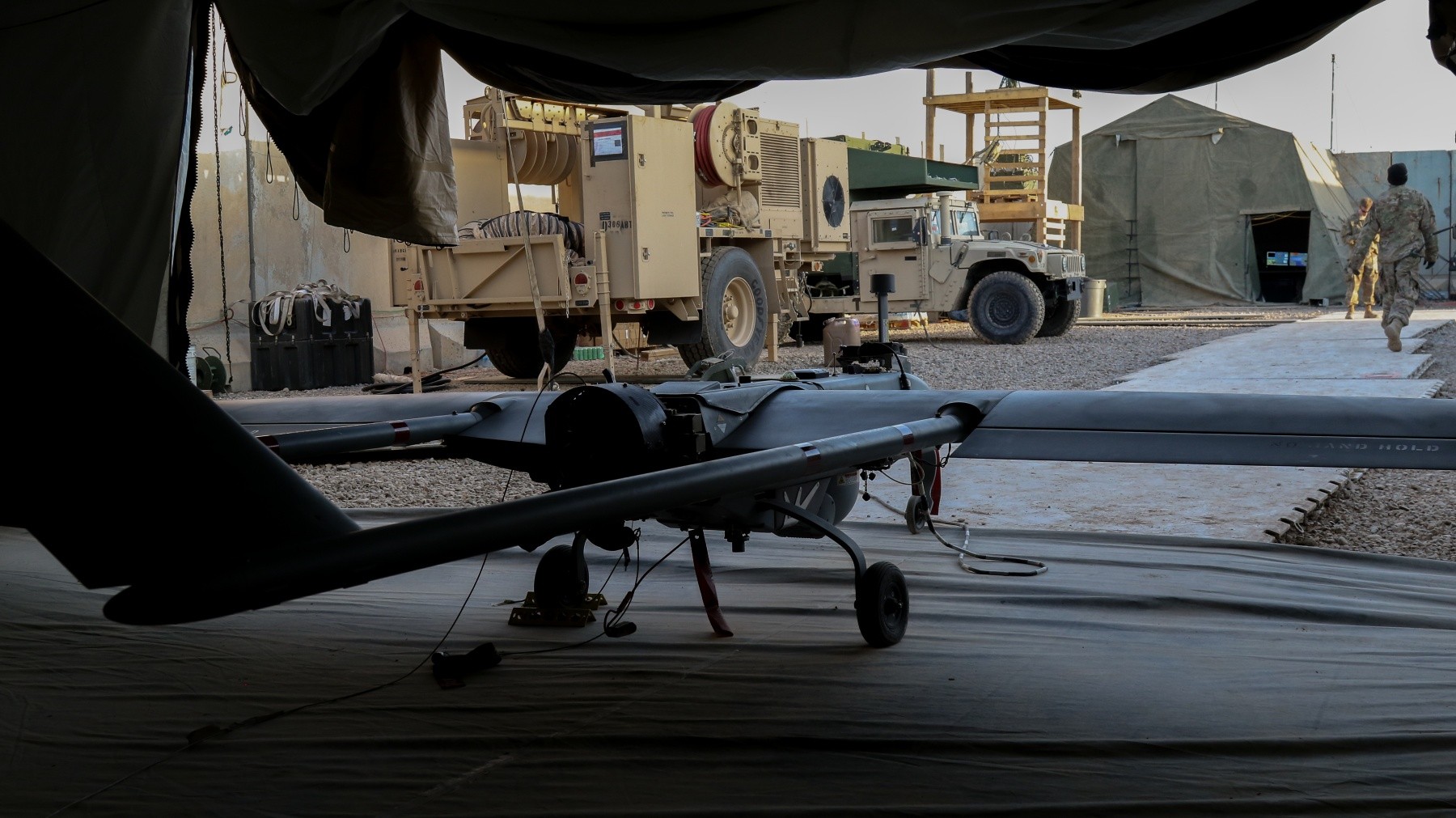 An RQ-7 Tactical Unmanned Aircraft System from the 2nd Brigade Combat Team, 82nd Airborne Division, sits in a hanger in Iraq, Jan. 26, 2017. The 2nd BCT, 82nd Abn. Div., is deployed in support of Operation Inherent Resolve, and enables their Iraqi se...
