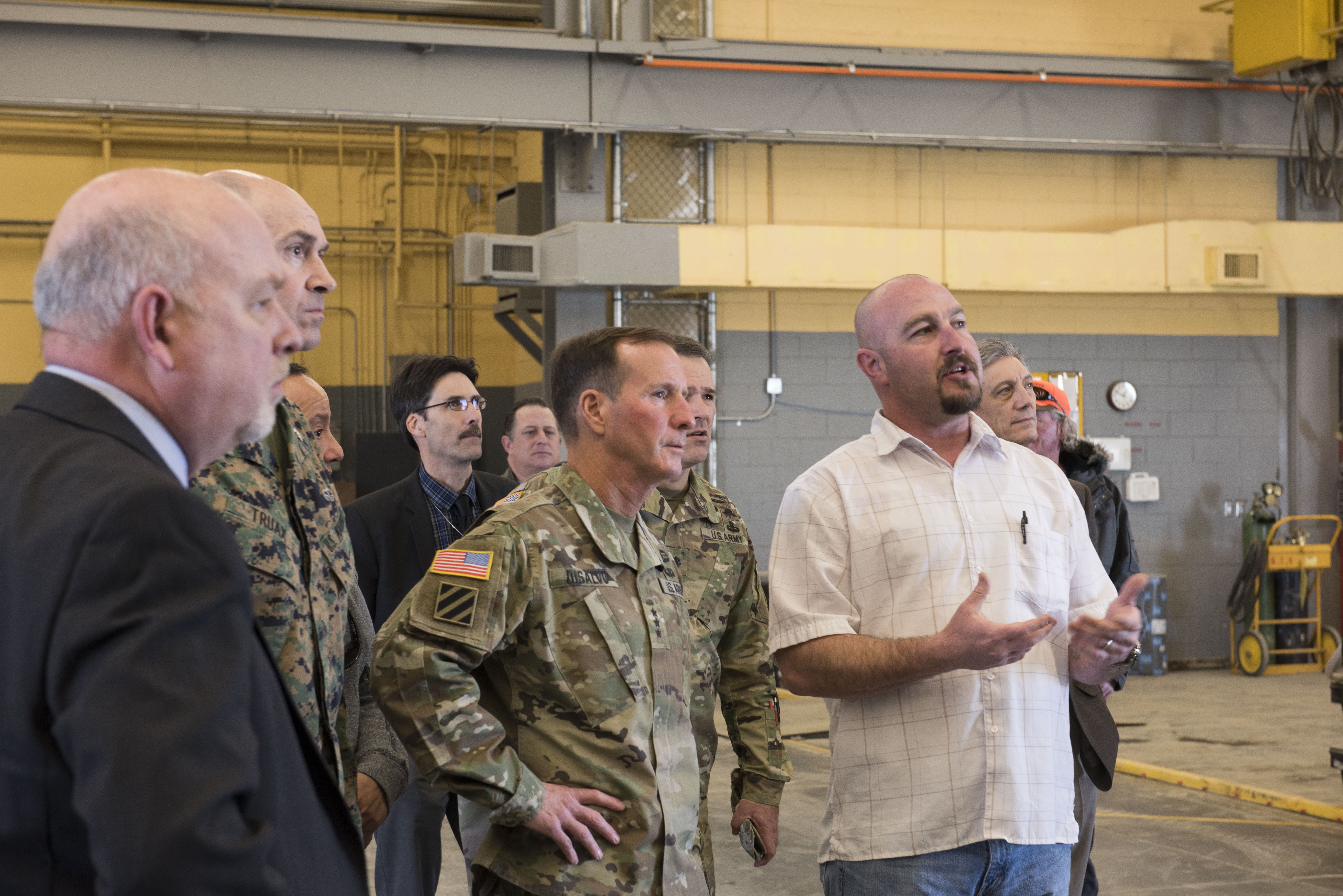 The director of the TACOM Security Assistance Management Directorate, Bert Liptak, provided the EDA briefing and discussed the visibility of materiel with DiSalvo. During a tour of the installation, DiSalvo visited the Retrograde and Redistribution, Reserve Clothing, Containerization/Armor and Water Reset facilities.