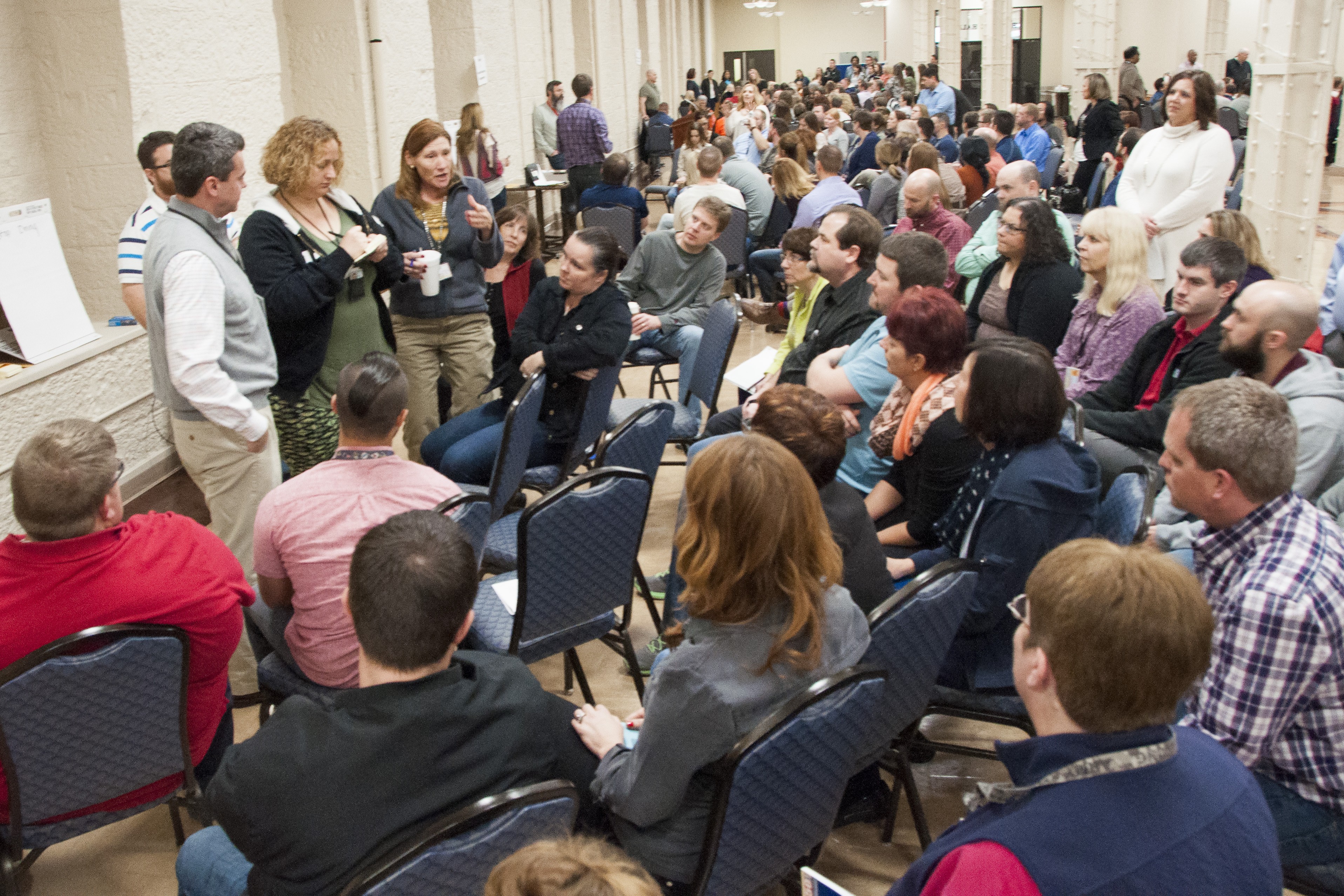 Managers facilitated group discussion while employees -- divided into eight smaller groups -- shifted from station to station, each dealing with a different topic.