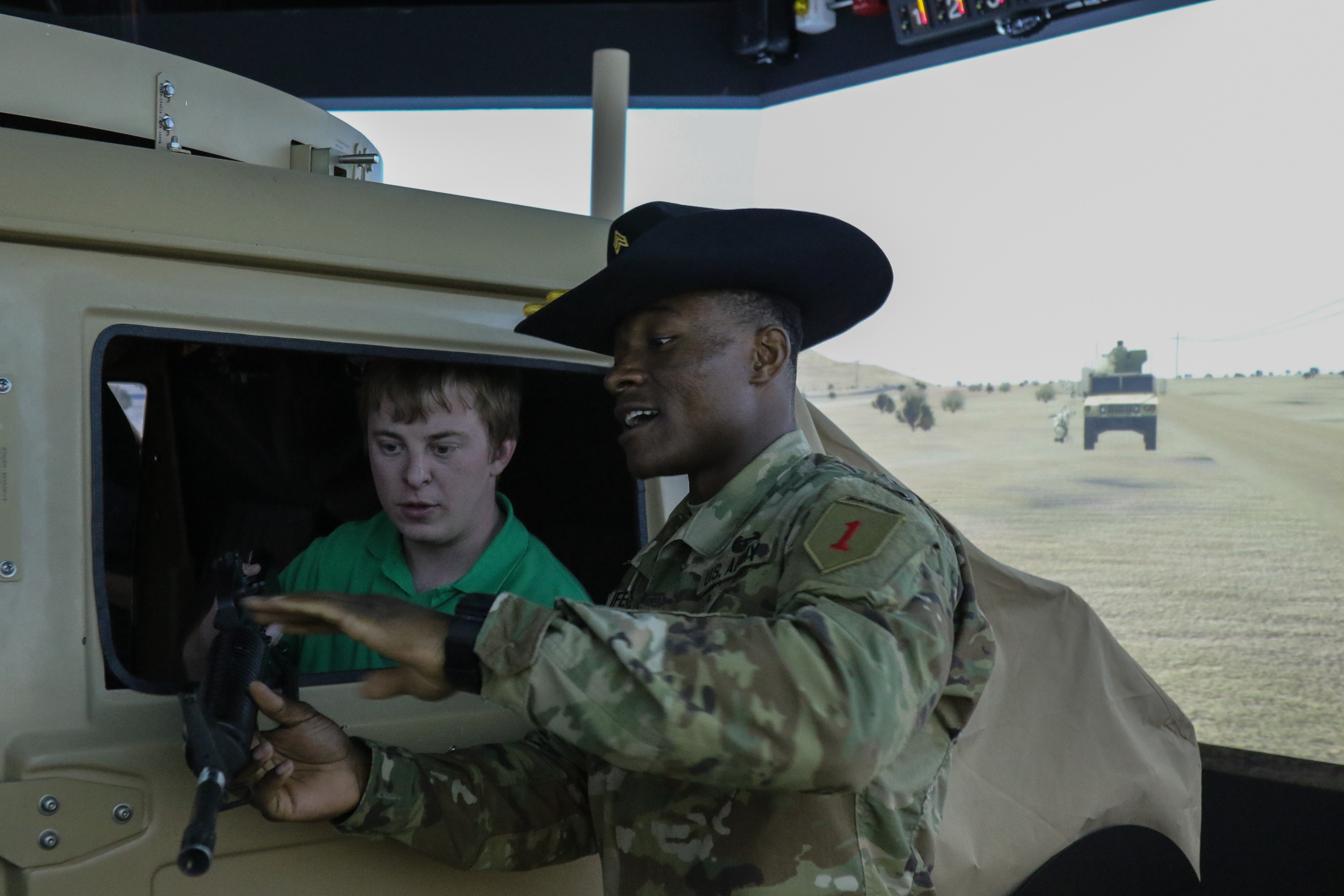 Soldiers from 5th Squadron, 4th Cavalry Regiment, 2nd Armored Brigade Combat Team, 1st Infantry Division, hosted the students as part of their annual Adopt-A-School activity. Chapman High School students got the opportunity to experience simulator exercises on military vehicles at various locations on Fort Riley.