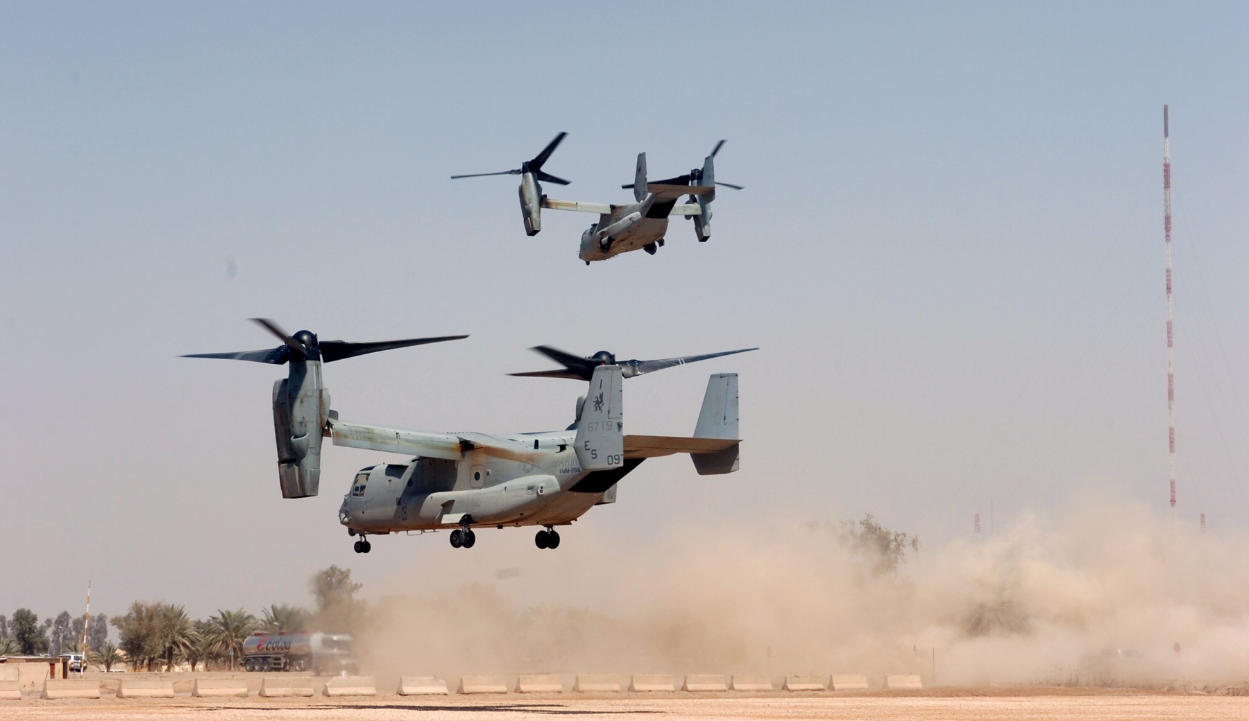 CAMP LIBERTY, Iraq - Two U.S. Marine Corps MV-22 B Osprey tilt-rotor aircraft take off from Liberty Command Pad March 19. When it comes to how it flies, the Osprey combines the best of both worlds with the ability to take off and land like a helicopt...