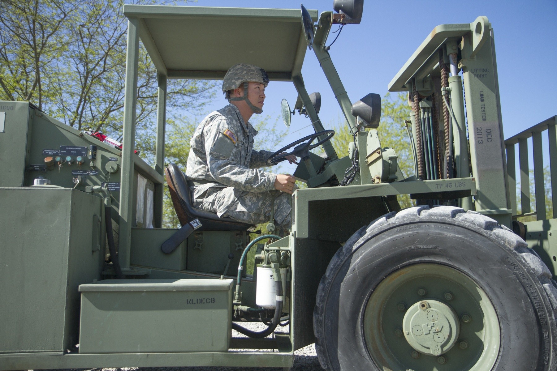 Spc. Sung Ahn with the 119th Inland Cargo Transportation Company mans a 4k vehicle, helping to load up supplies for Exercise Guardian Response 17 at Camp Atterbury May 7. 81st Troop Command from joined forces with Guardsmen from all across the nation...