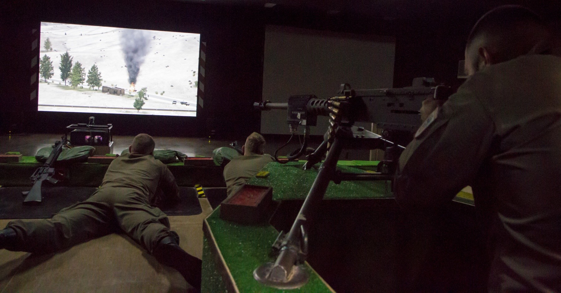 A soldier, assigned to the Austrian Contingent within Kosovo Force, fires the M2 .50 Caliber Machine Gun during a simulated virtual operation in the Engagement Skills Trainer II on Camp Bondsteel, Kosovo, June 12. The EST II is used to train soldiers...