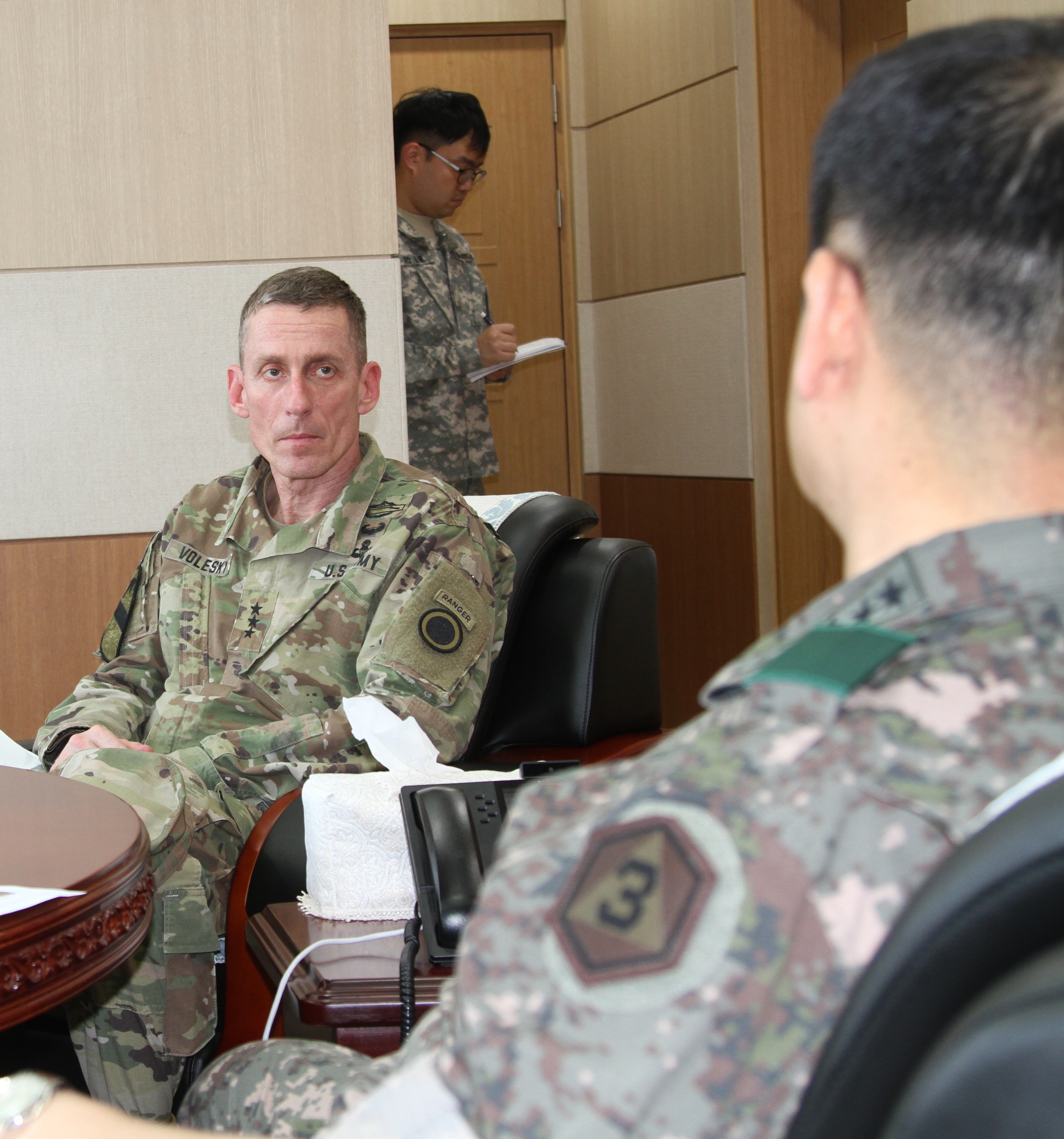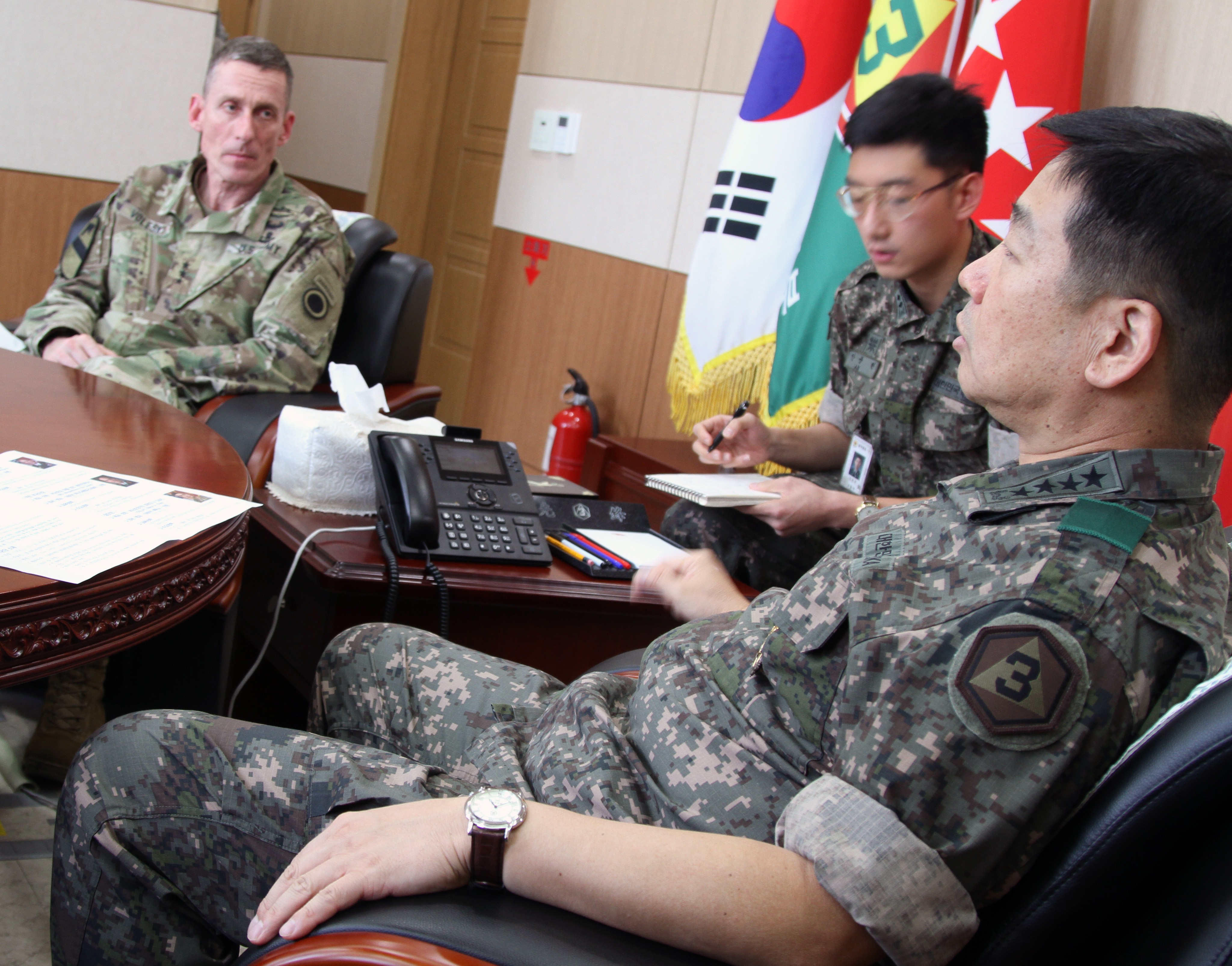 Lt. Gen. Gary Volesky (left), I Corps commanding general, meets with Gen. Woon-Young Kim, Third Republic of Korea Army commanding general to discuss their partnered operations during exercise Ulchi Freedom Guardian. UFG is designed to enhance readine...