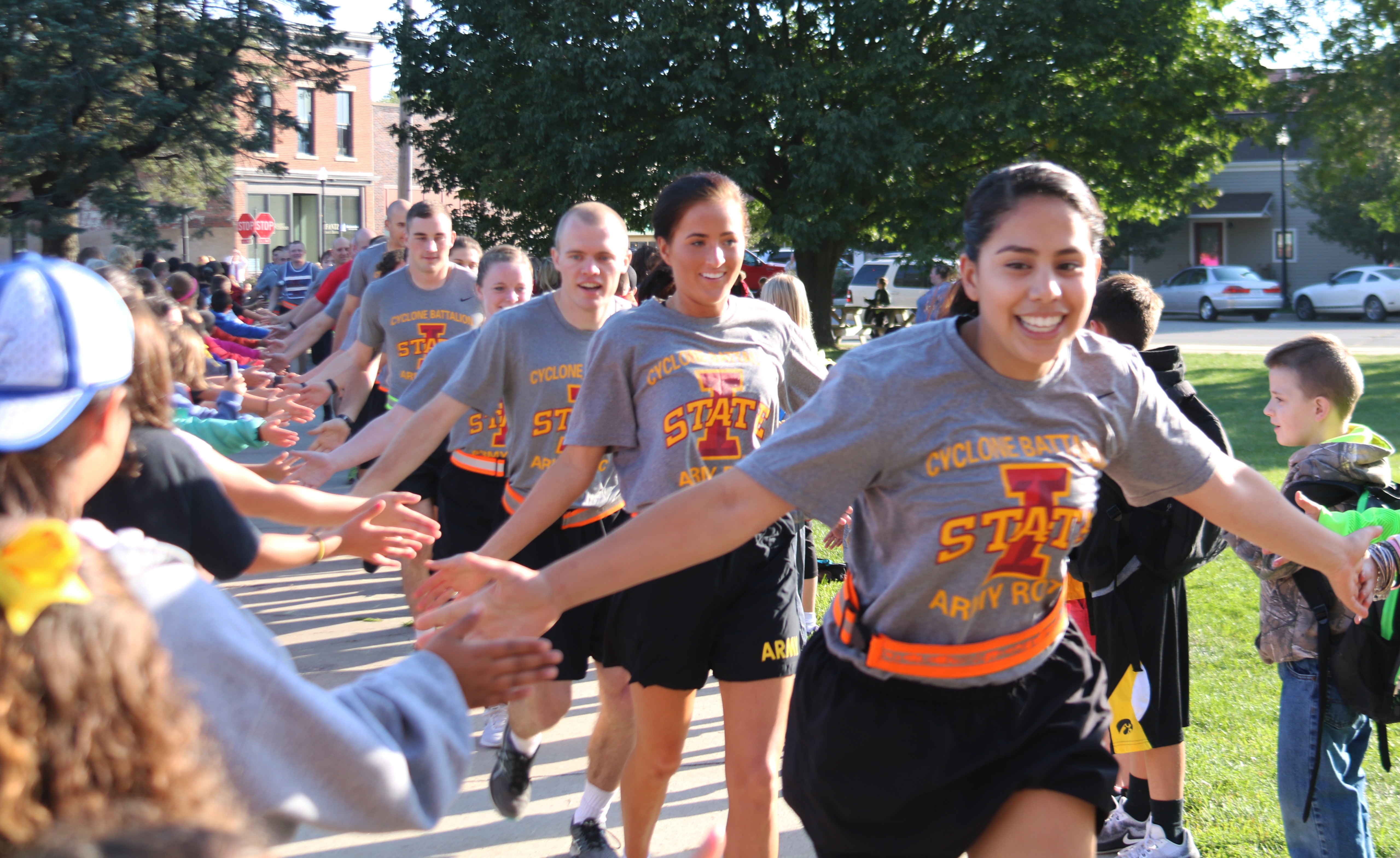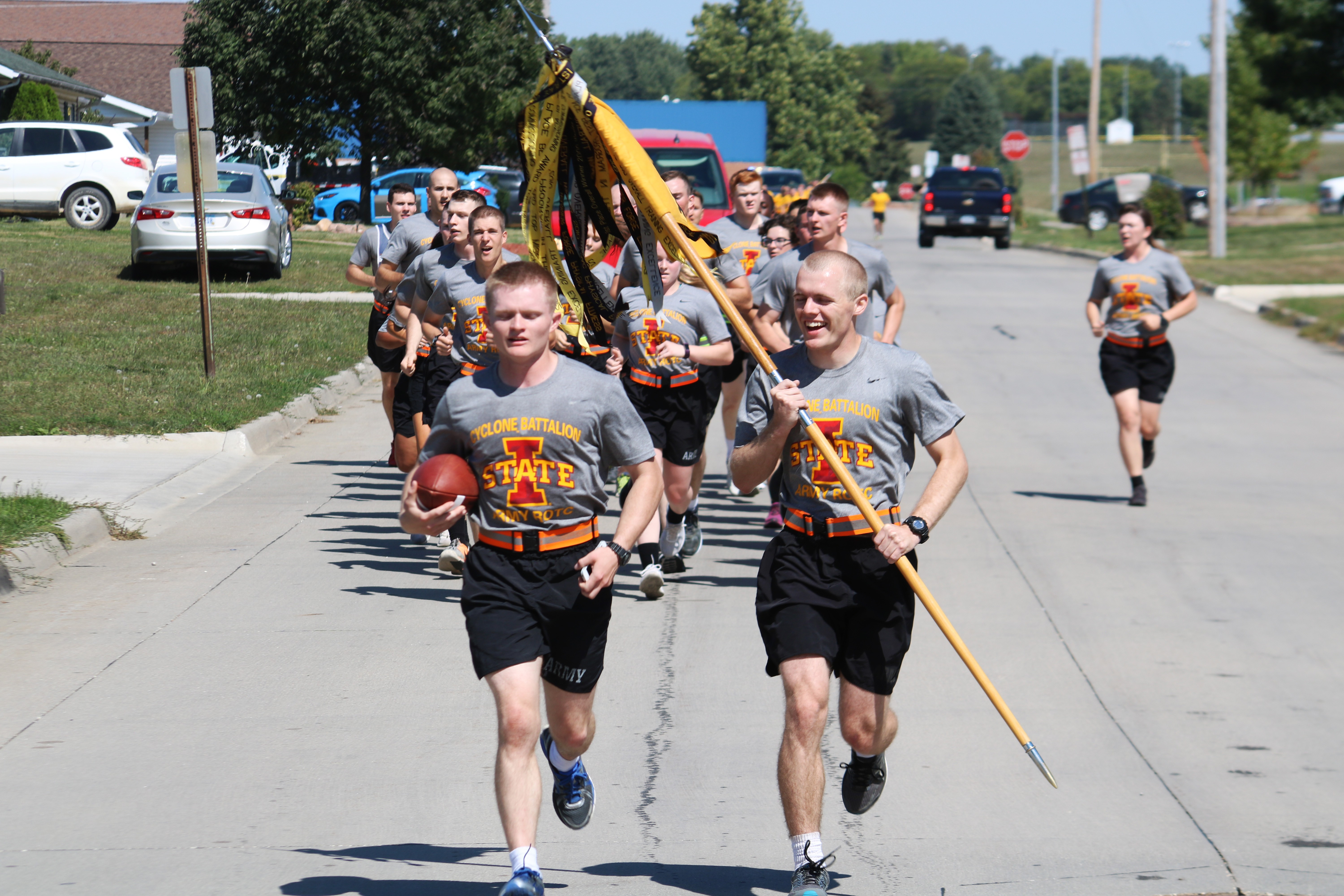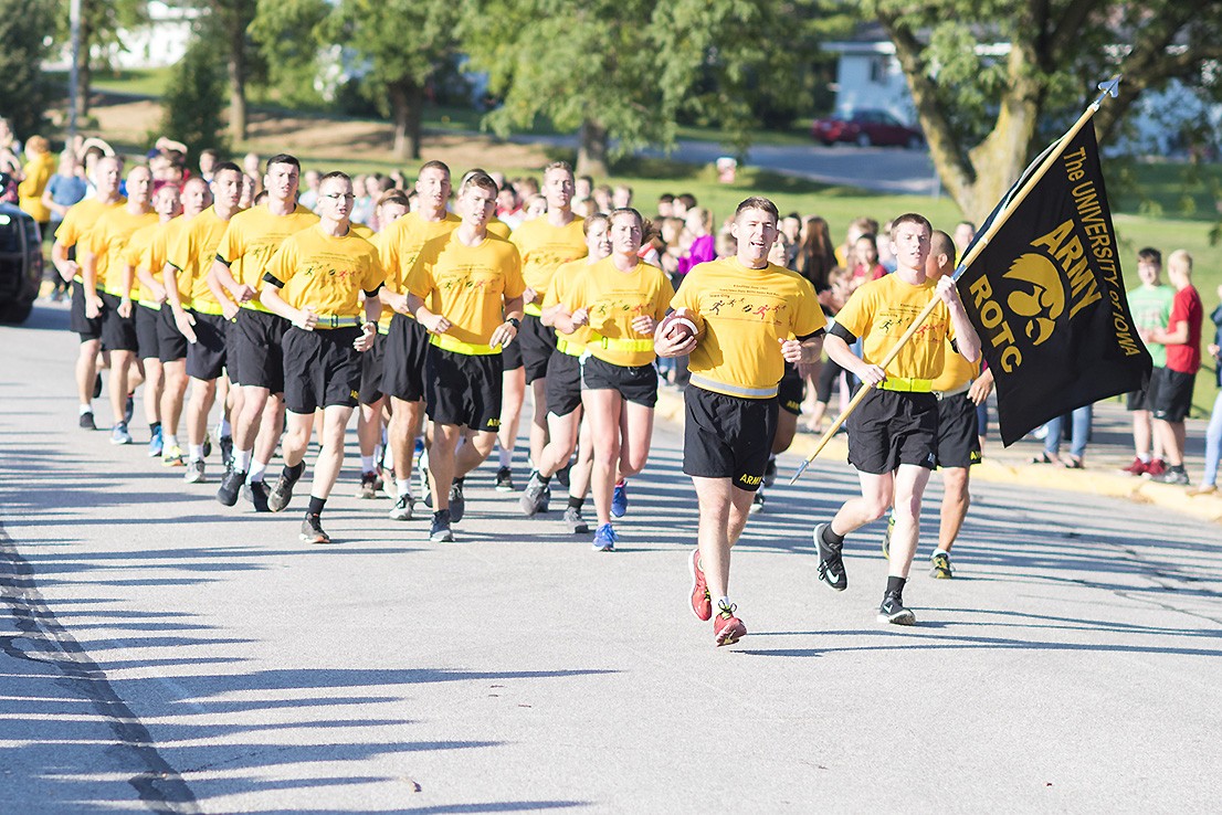 TAMA, Iowa -- Army ROTC Cadets from the University of Iowa and the Iowa State University of Science and Technology ran through eight cities to hand off and receive the Cyclone-Hawkeye football series game ball, Sept. 8.