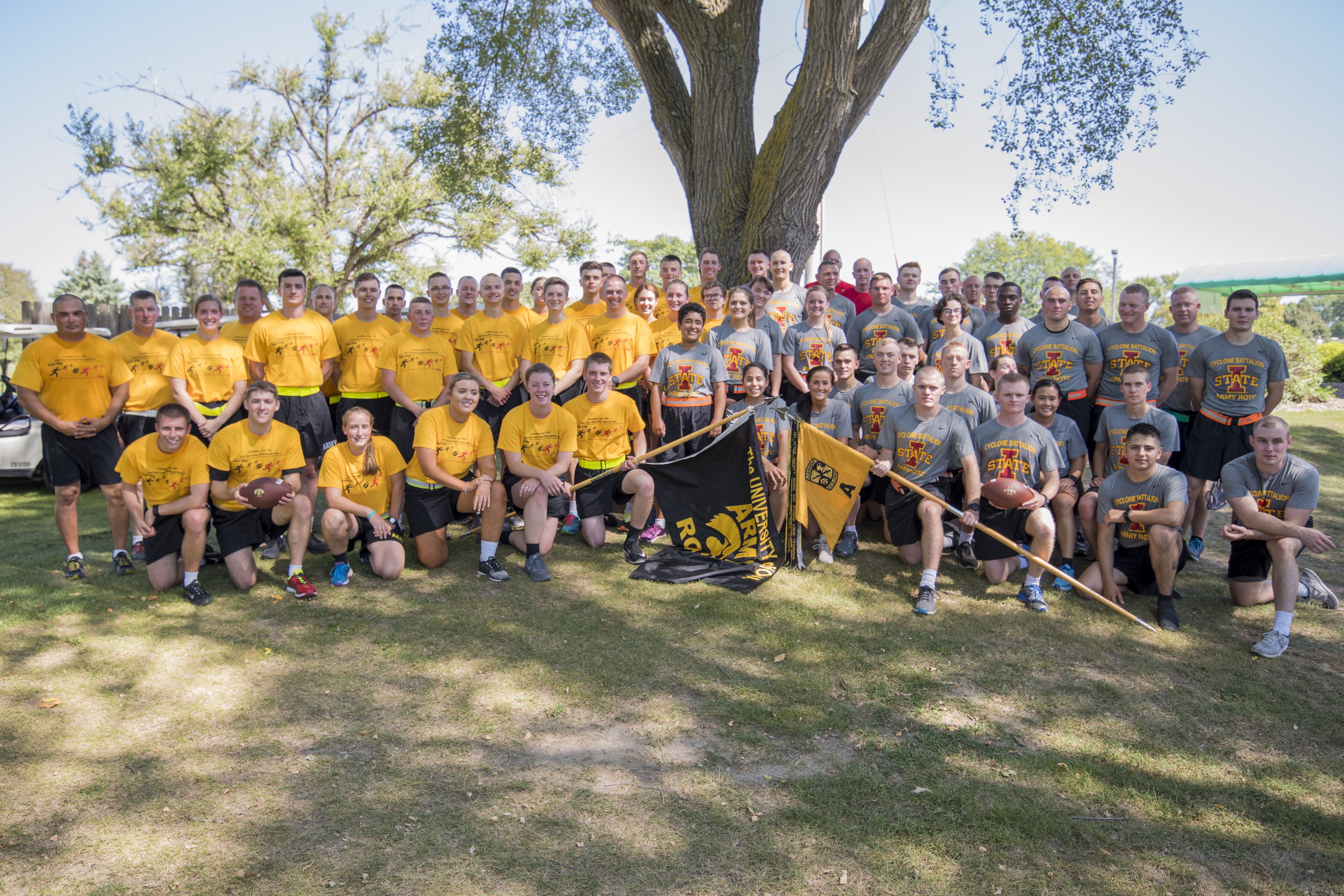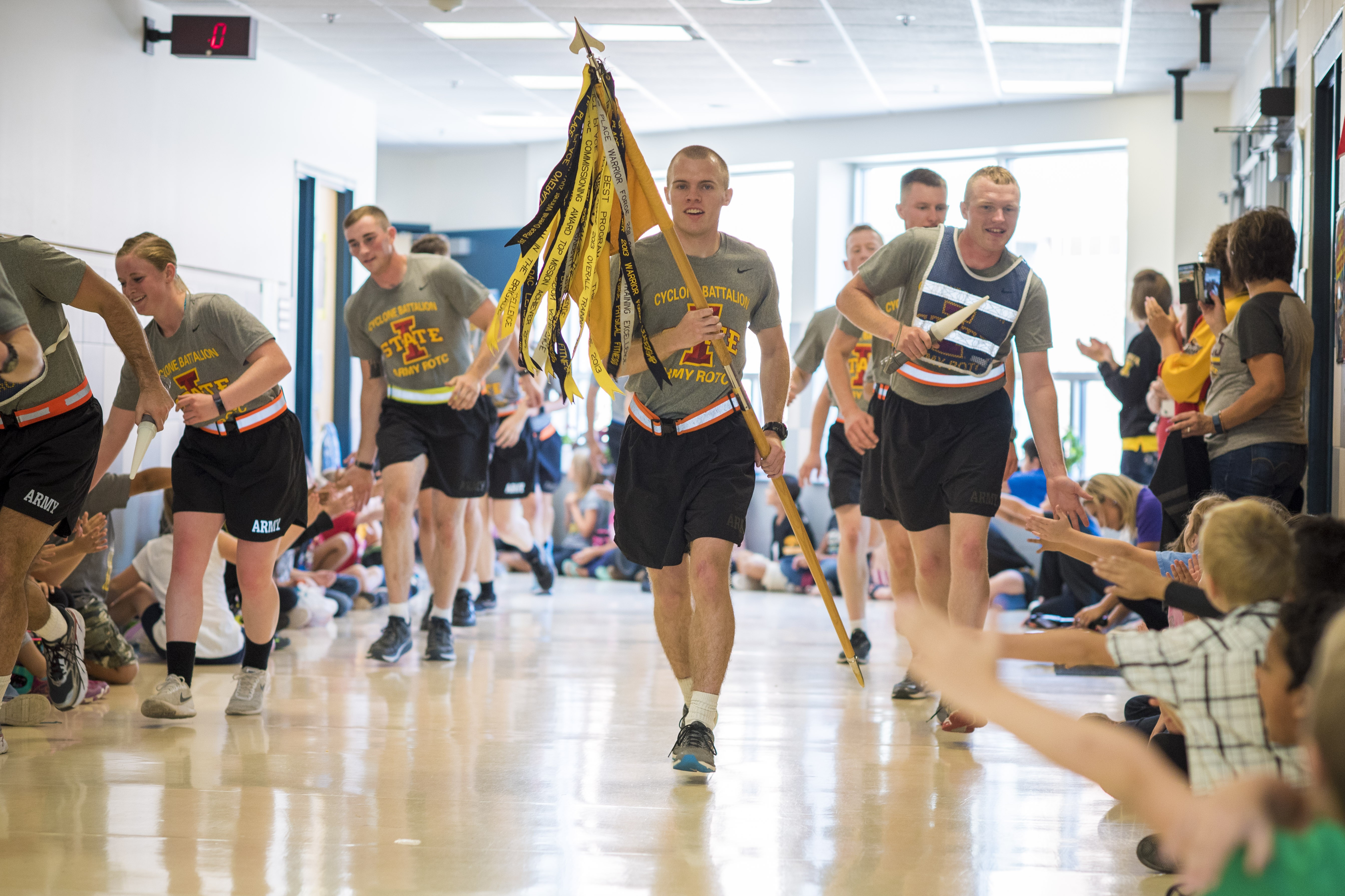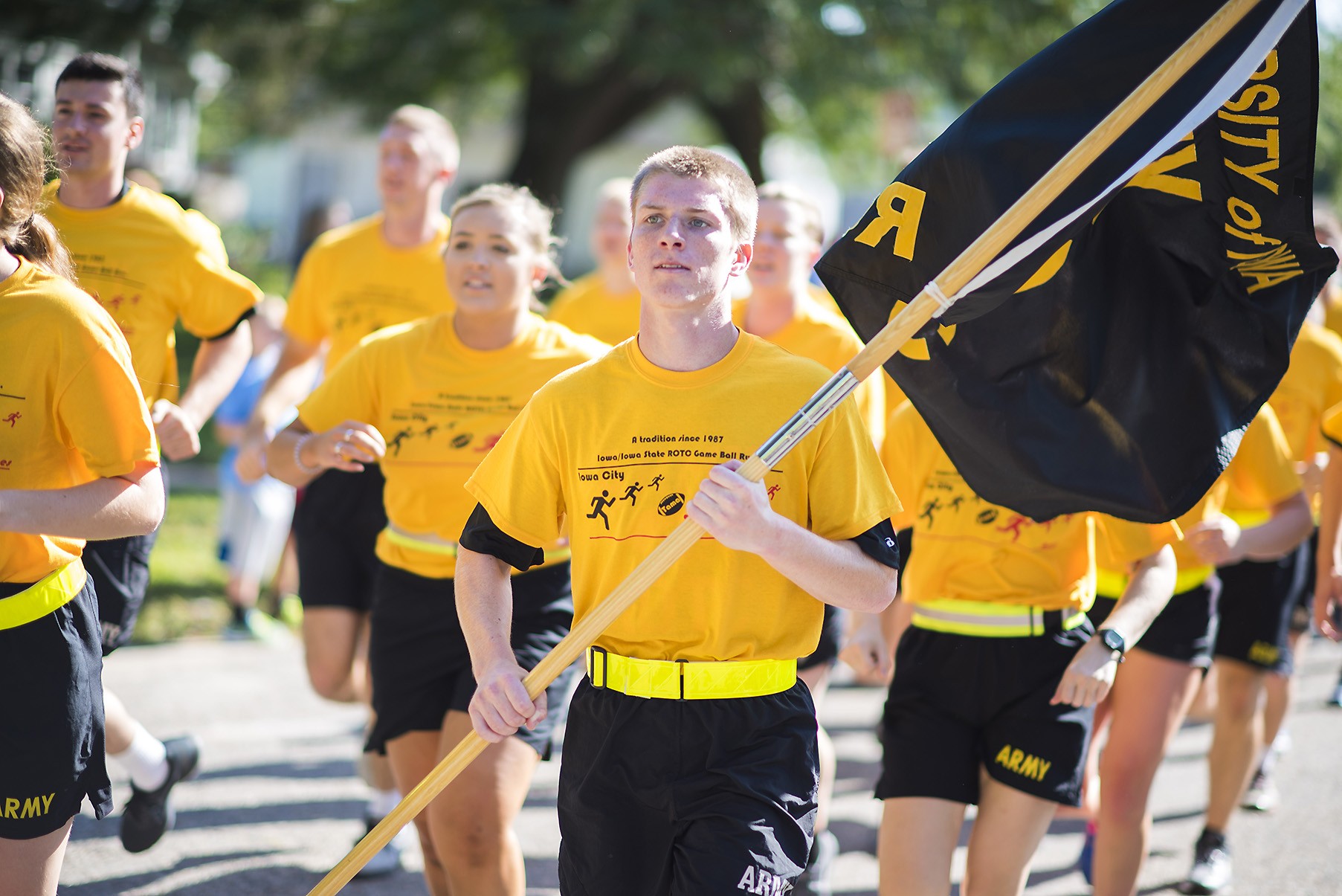 TAMA, Iowa -- Army ROTC Cadets from the University of Iowa and the Iowa State University of Science and Technology ran through eight cities to hand off and receive the Cyclone-Hawkeye football series game ball, Sept. 8.