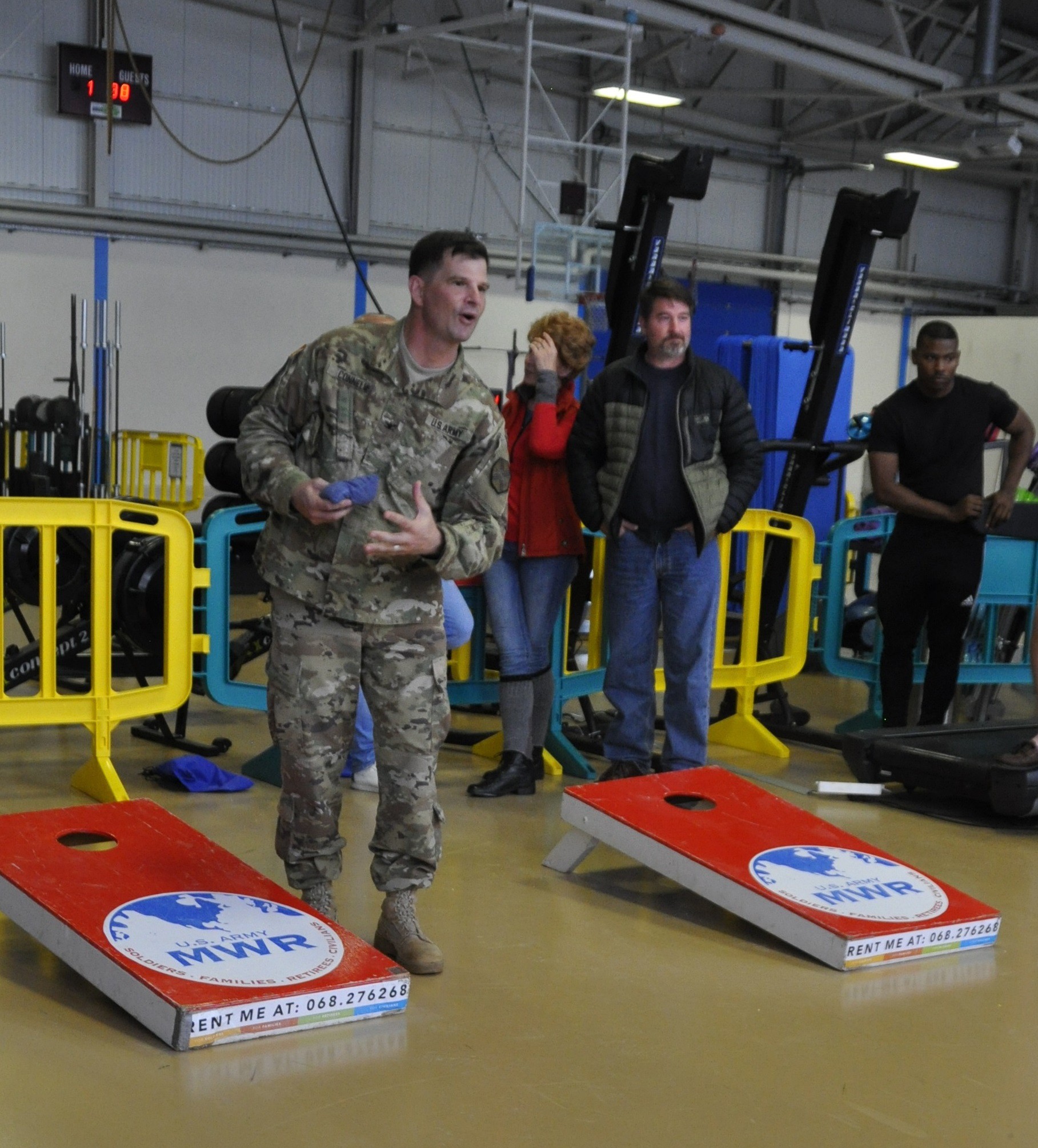 Garrison commander Col. Kurt Connell joins employees in a friendly game of cornhole and tries to throw the beanbag into the hole during the Organization Day Sept. 22, 2017, at Chièvres Air Base, Belgium. The organization day brought garrison e...